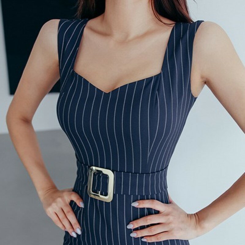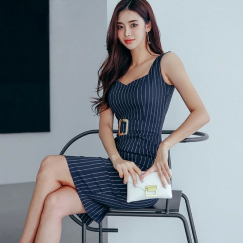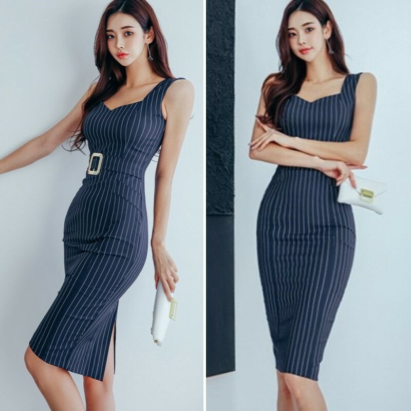 ストライプ ワンピース ノースリーブ タイト ミディ クラブ ドレス ベルト ウエストマーク スリット ボディコン レディース E18 スカーレ