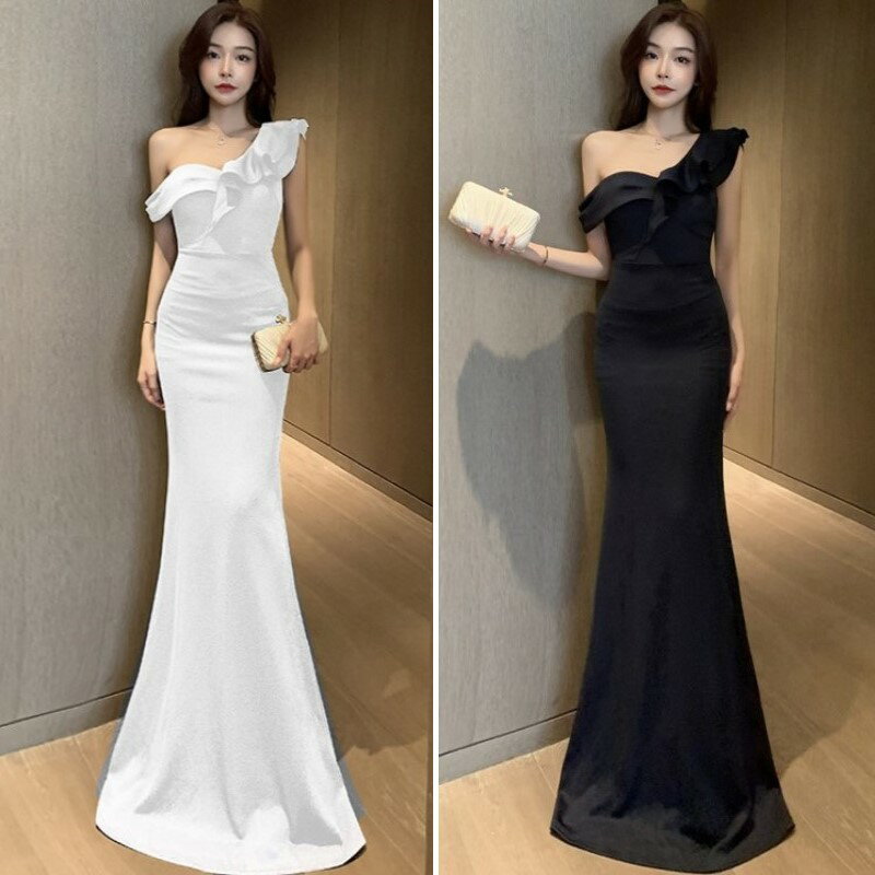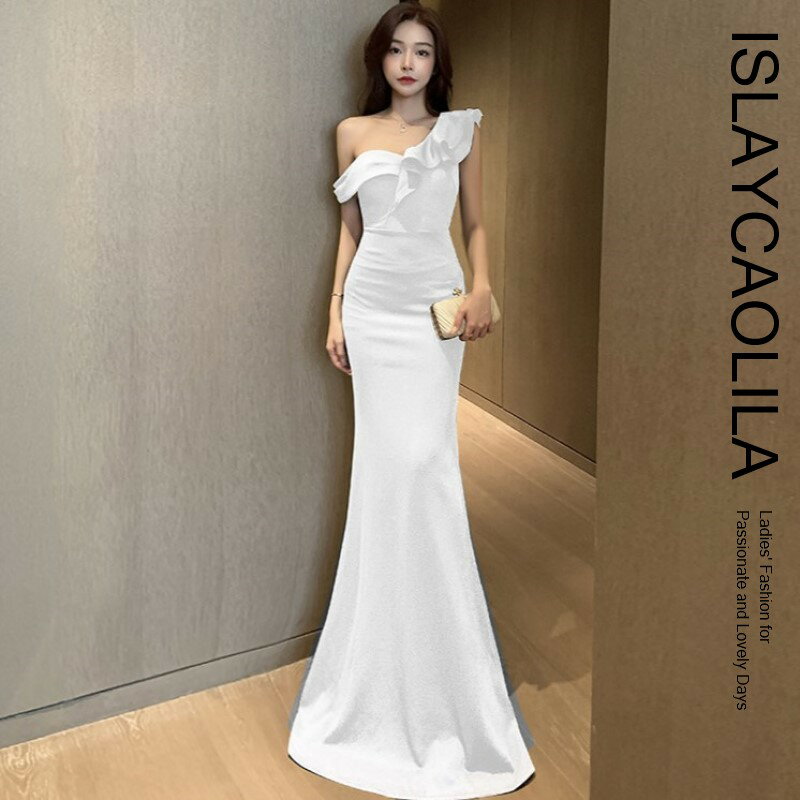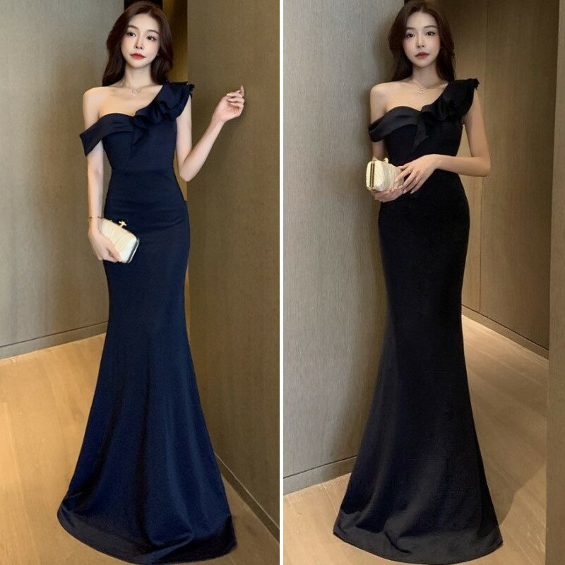ロング フレア ワンピース ワンショルダー マキシ イブニングドレス ワンショル ノースリーブ ウエストマーク レディース E41 カレン