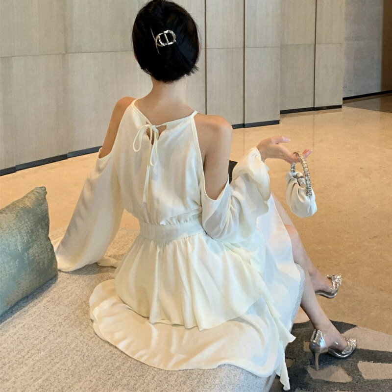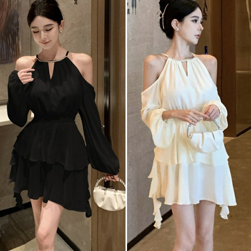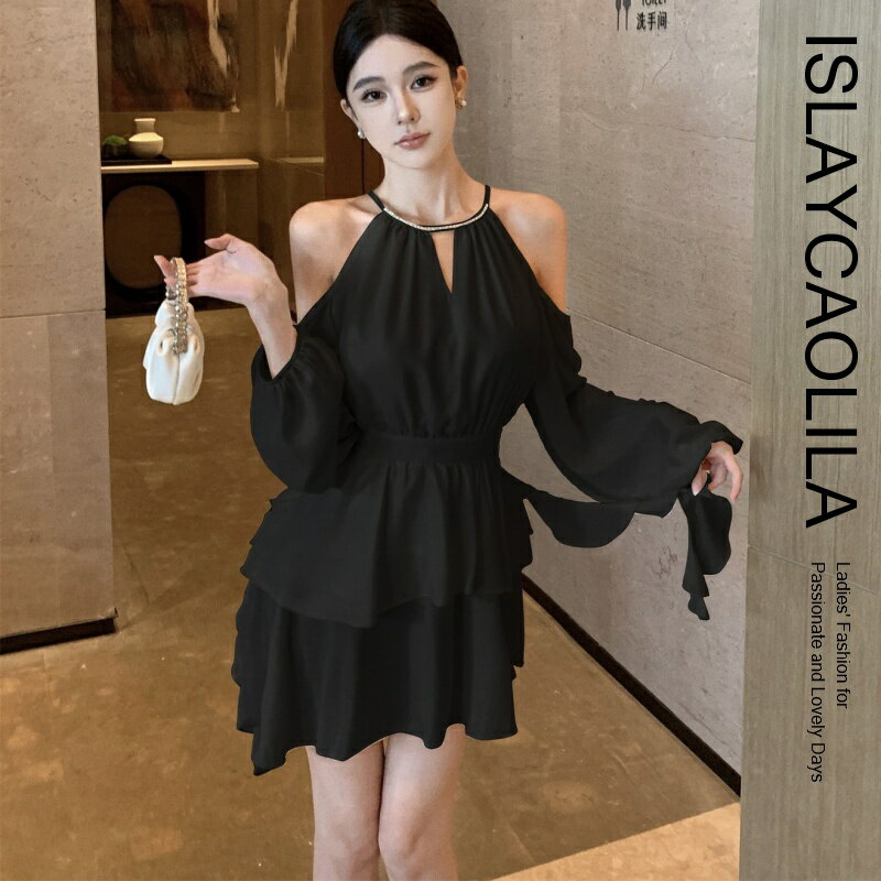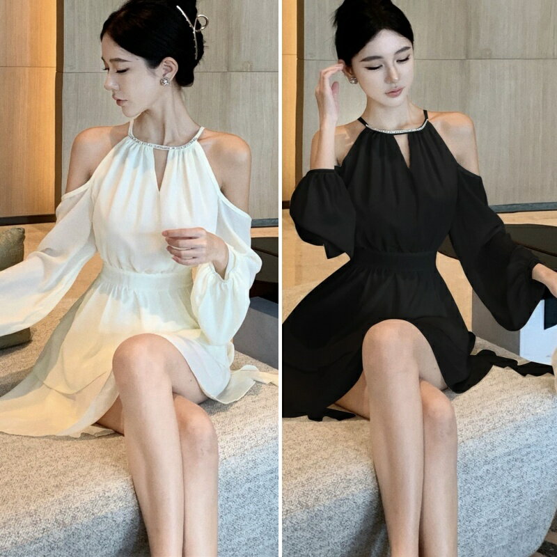 フリル ワンピース ホルターネック フレア ミニ クラブドレス オフショルダー 長袖 ウエストマーク レディース E92 ラウラ