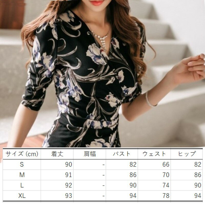 カシュクール ワンピース 花柄 タイトミニ クラブドレス Vネック 五分袖 アシンメトリー スリット ひざ上 ミニ レディース C14 クレア