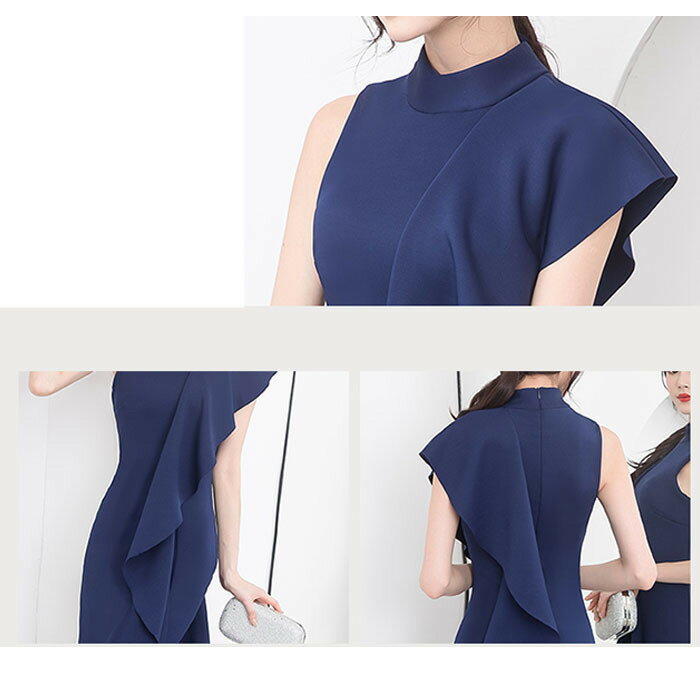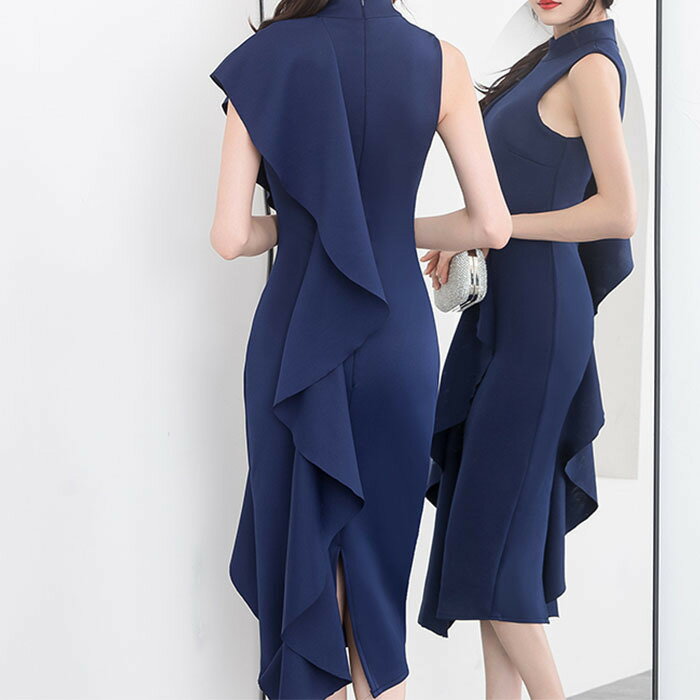 パーティドレス タイト ノースリーブ フレンチスリーブ ワンピース おしゃれ フリル ロング丈 スリット 結婚式 二次会 ハイネック 春 秋 冬 ブラック ホワイト ワイン レッド アシンメトリー パーティ