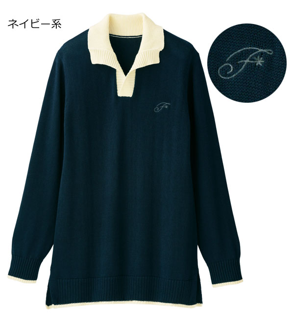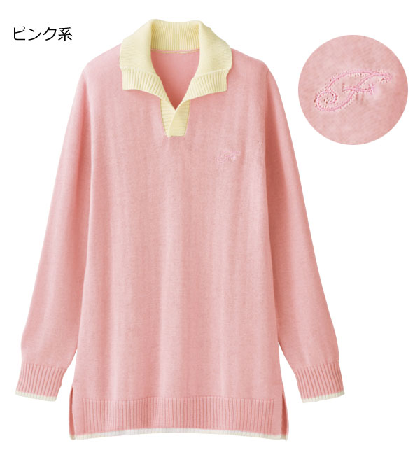 スキッパーニット配色プルオーバー 同サイズ2色組 スキッパー衿 両脇スリット入 綿100% 春秋 レディース 婦人服 961550