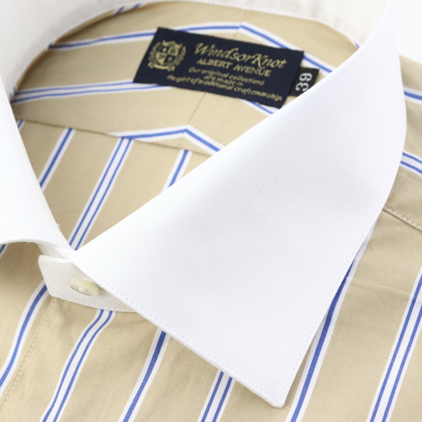 ワイシャツ ワイド クレリック ダブルカフス ドレスシャツ ベージュ スモーキーカラー レトロ ストライプ 綿100% 日本製 | 祝い 結婚式 ブランド おしゃれ プレゼント メンズ 男性 ギフト 高級 英国