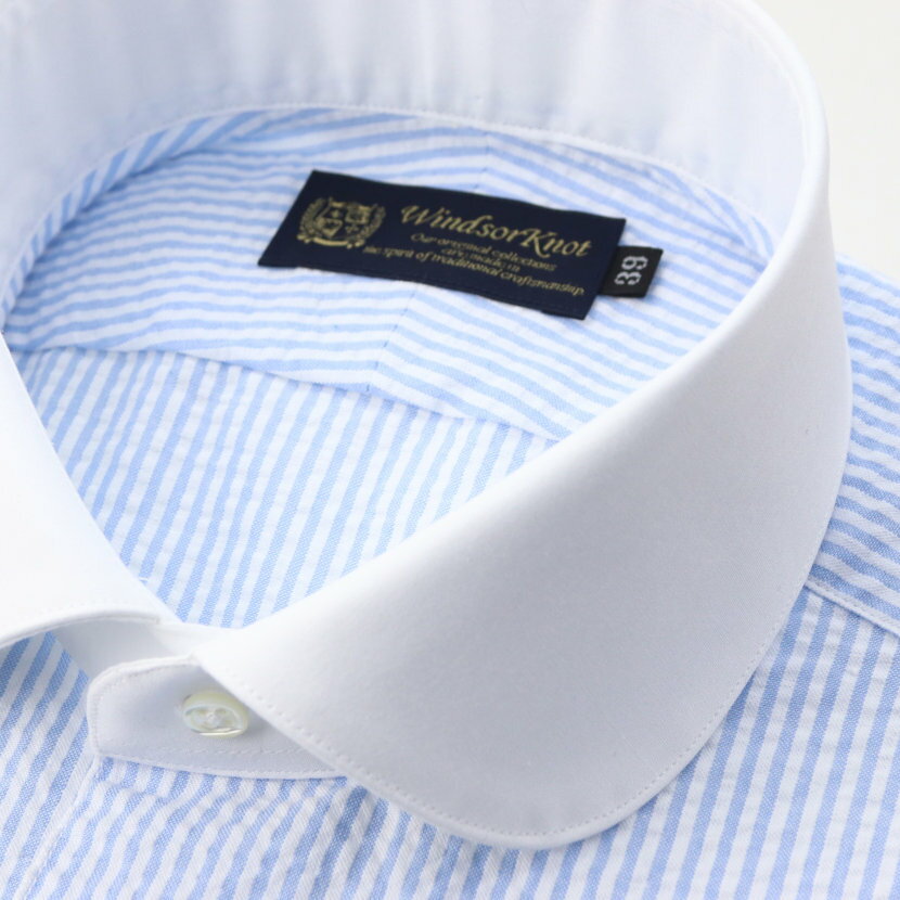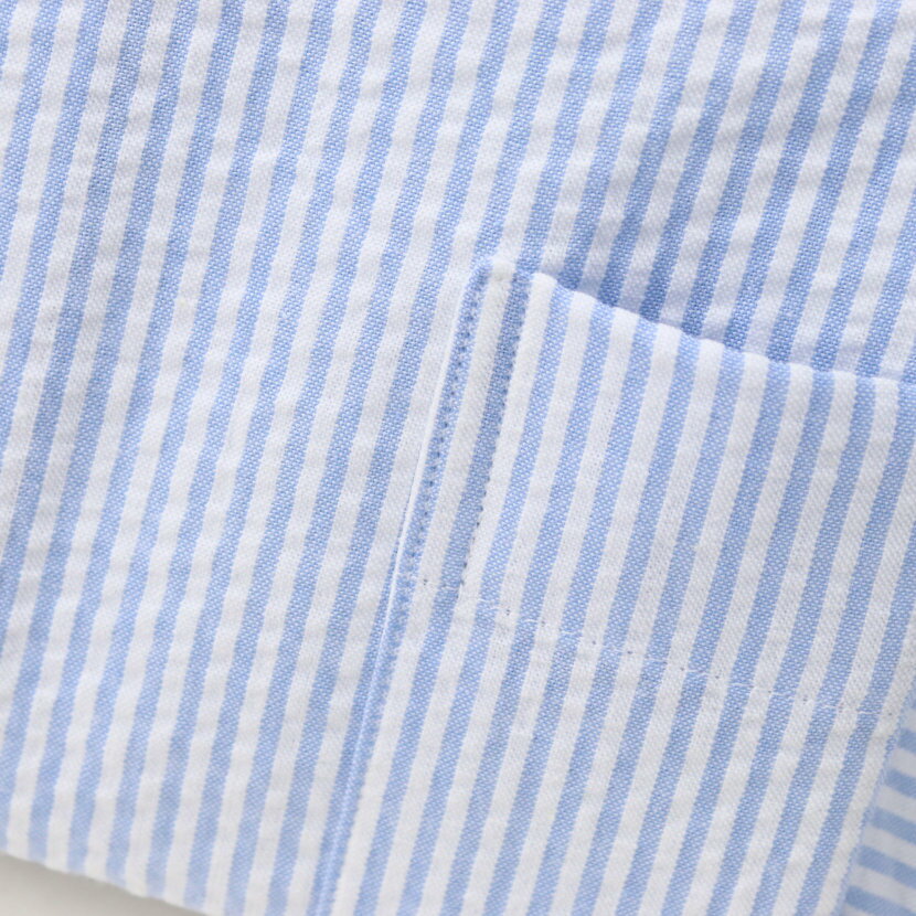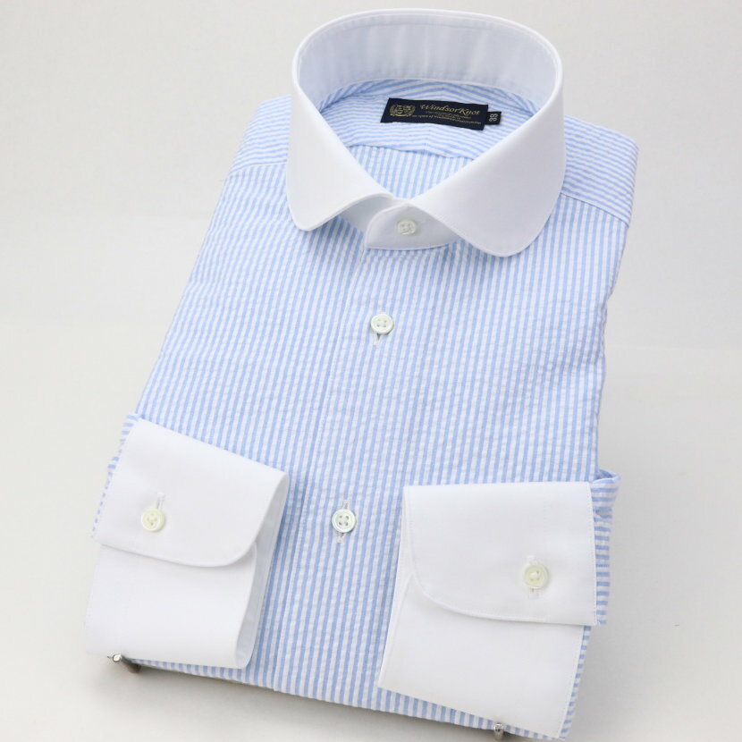 ワイシャツ シアサッカー クレリックシャツ ラウンドカラー ブルー ストライプ 長袖 クレリック ドレスシャツ 日本製 綿100% | 祝い 結婚式 ブランド おしゃれ プレゼント メンズ 男性 ギフト 高級 かっこいい