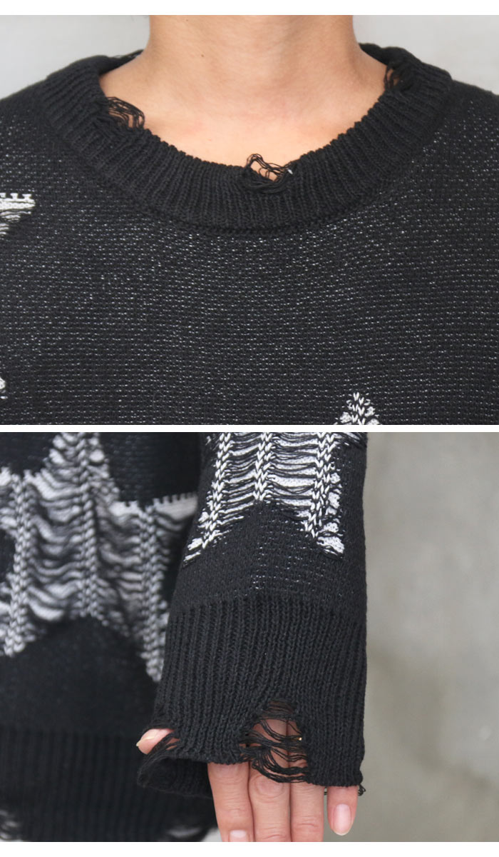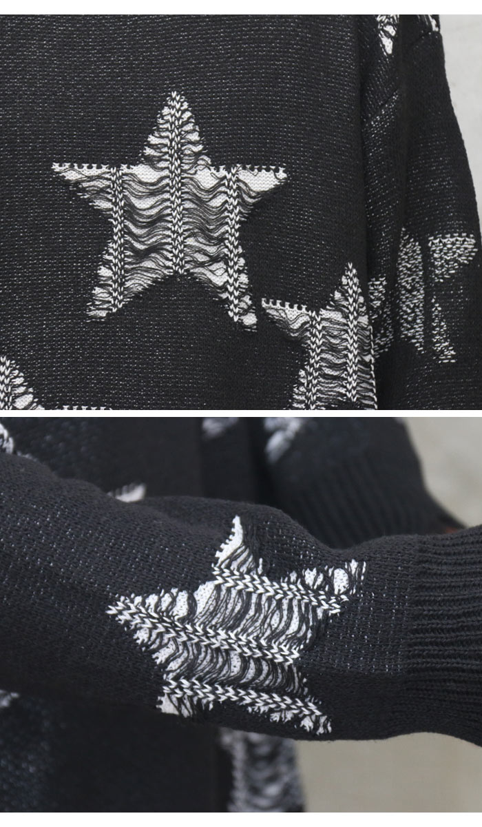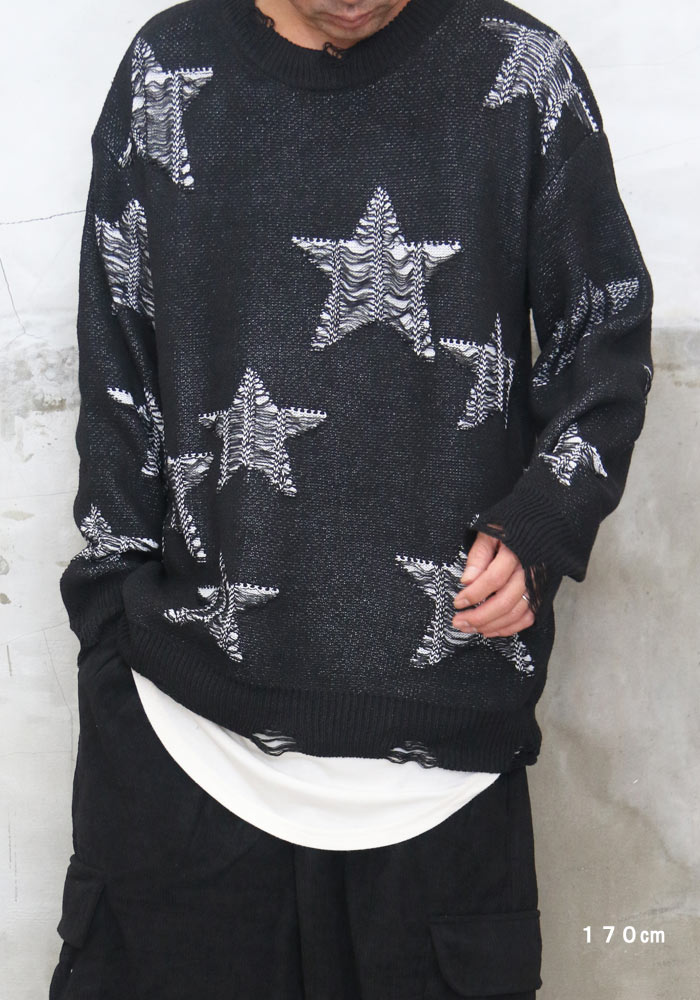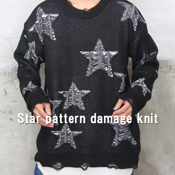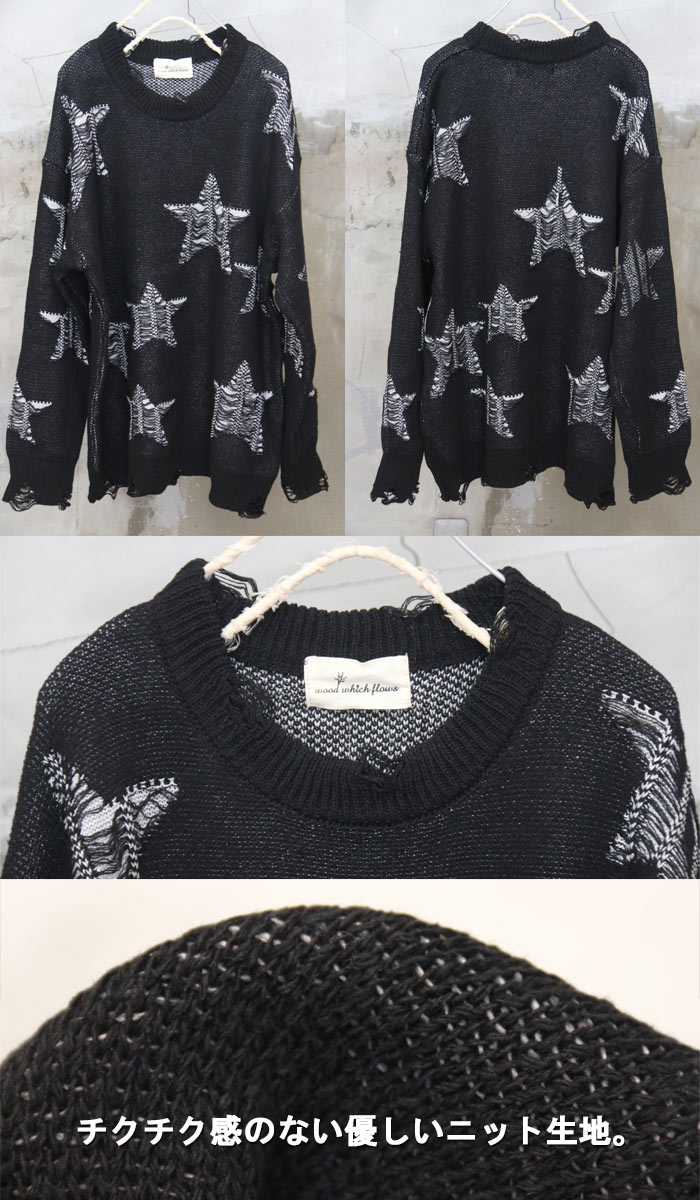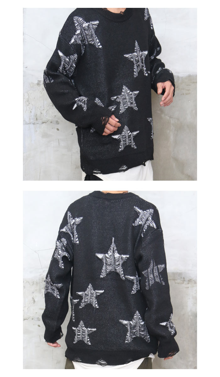星柄ダメージニット メンズ 星柄ニット ニット メンズ 長袖ニット ダメージニット ラフニット 星ニット 長袖 星 スター ダメージ ゆるスッキリ ブラック ちくちくしない ニット ほっこり 防寒対策 秋冬 秋服 メンズ 冬服 メンズ 長袖 woodwhichflows