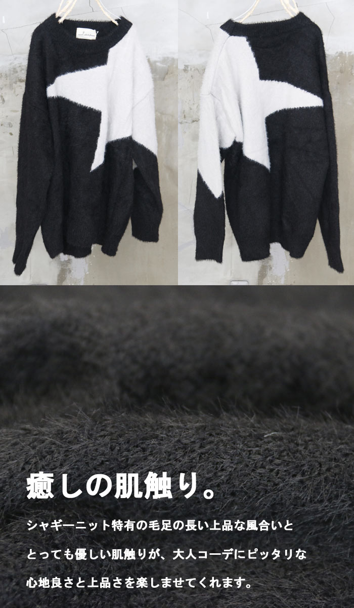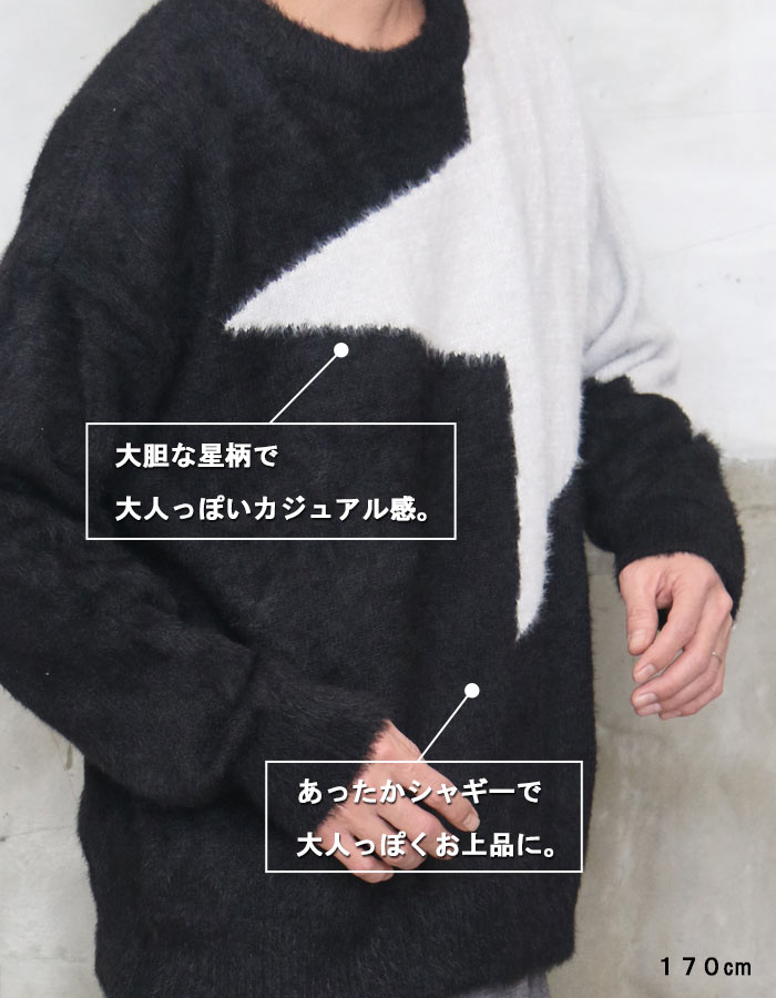 星柄シャギーニット メンズ 星柄ニット ニット メンズ 長袖ニット スターニット シャギーニット 上品ニット カジュアルニット チクチクしないニット 長袖 星 スター star 暖かい あったか ちくちくしない インナー使い 重ね着 秋服 メンズ 冬服 メンズ 長袖 厚手 ブラック