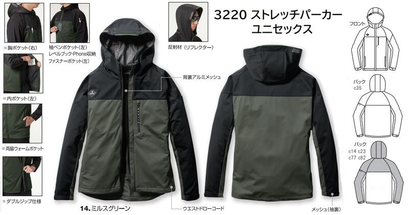 ストレッチパーカー(ユニセックス)3230 S-XXL 全5色ストレッチニット ラミネートコーティング ポリエステル100%バートル 防寒物 2023-24AW 新商品