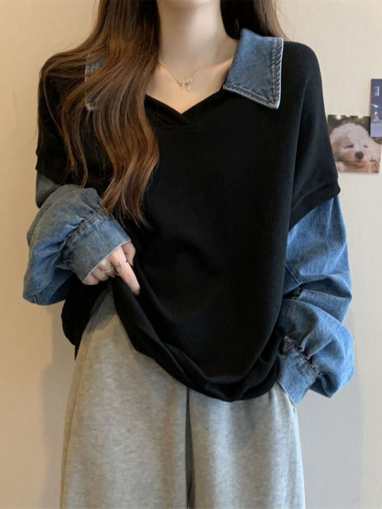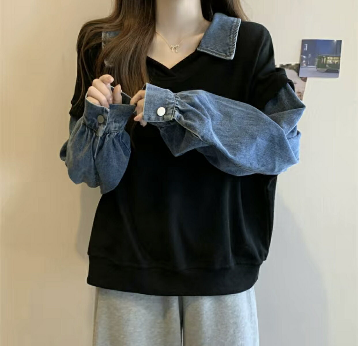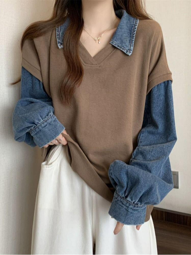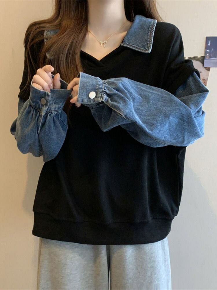 トレーナー レディース 重ね着風 異素材切り替え 長袖 Vネック フレア プルオーバー バイカラー ドッキング デニム えり 襟 かわいい 大人可愛い 大人女子 こなれ感 シンプル カジュアル 大人 おしゃれ お洒落 ラフ ヘルシー 無地 秋 30代 40代 LUFA006(2色L-4XL)