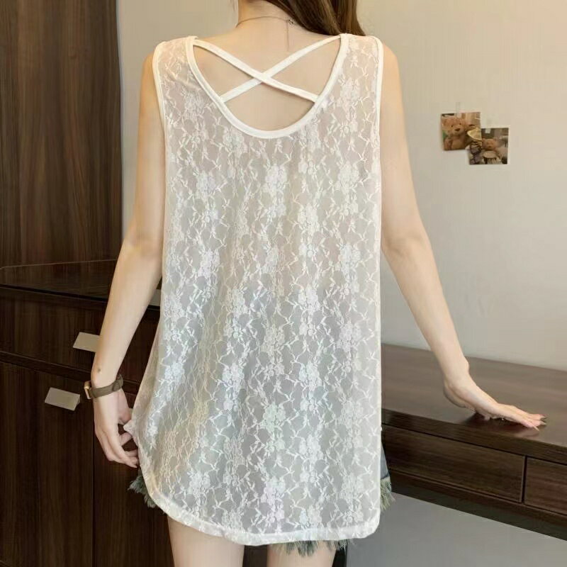 タンクトップ レイヤード レディース キャミソール 重ね着 インナー Tシャツ 花柄 レース ノースリーブ 透け感 ロング トップス 春夏 大きいサイズ レース カットソー 薄手 おしゃれ カジュアル シンプル LUFA150(2色M-3XL)