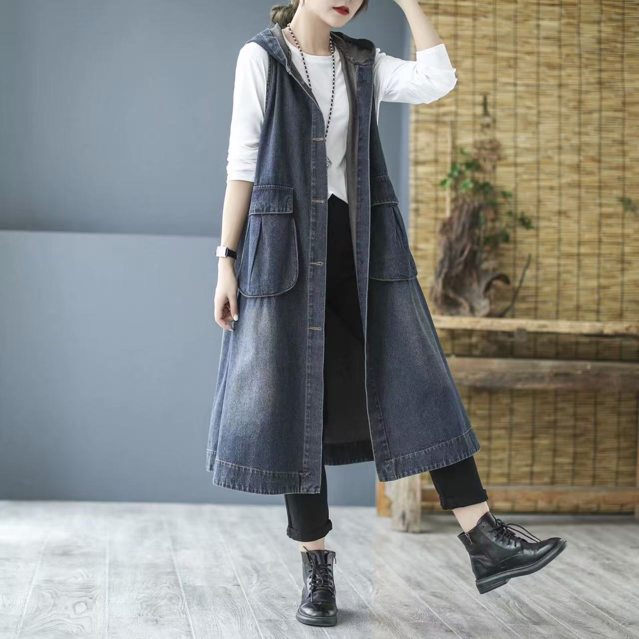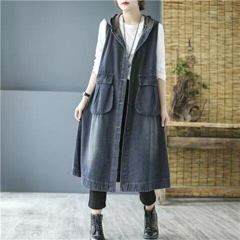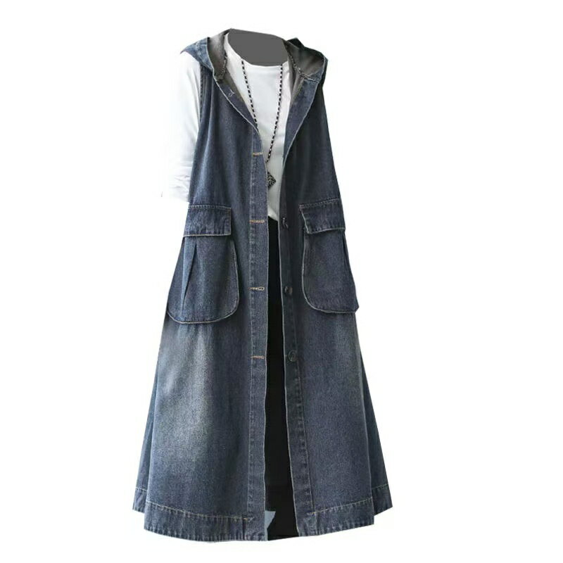 デニムベスト ロングベスト レディース ベスト マキシベスト デニム ロング丈 春 秋 袖なし フード付き 前開き ポケット付き ベストアウター ノースリーブ おしゃれベスト デニムベスト ベストジャケット ベストコート トップス ゆったり 体型カバー LCGA007(2タイプS-4XL)