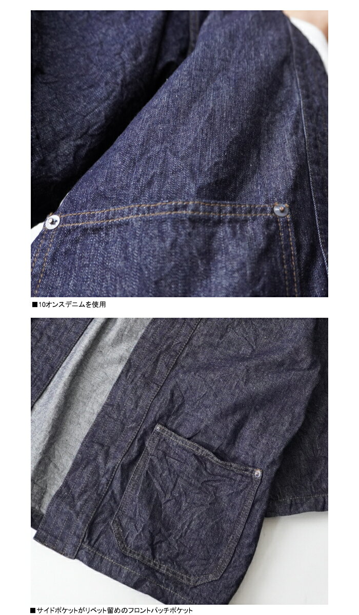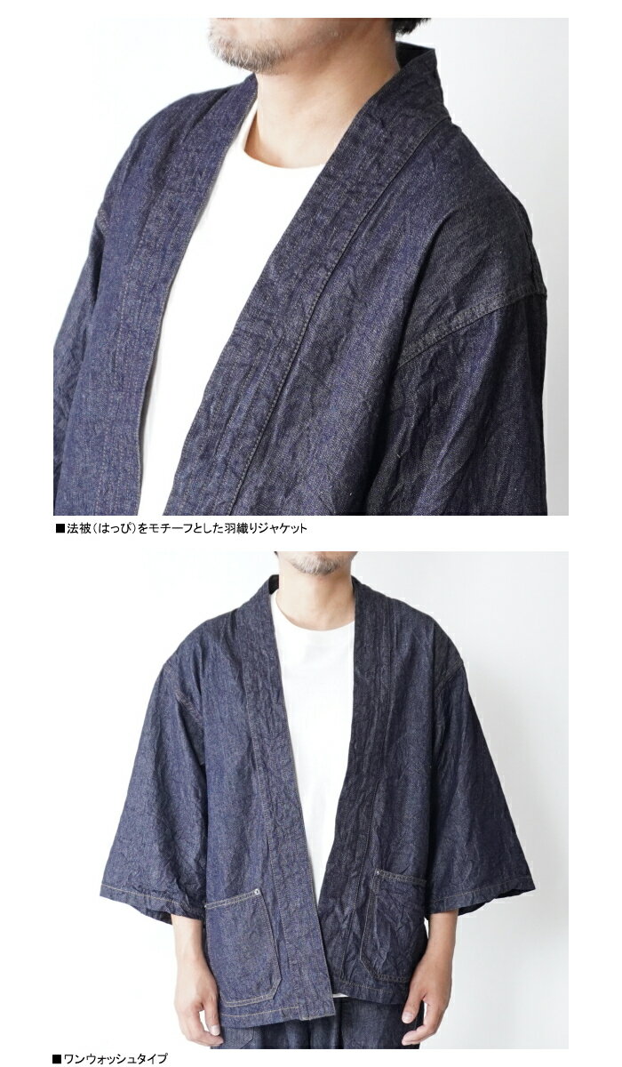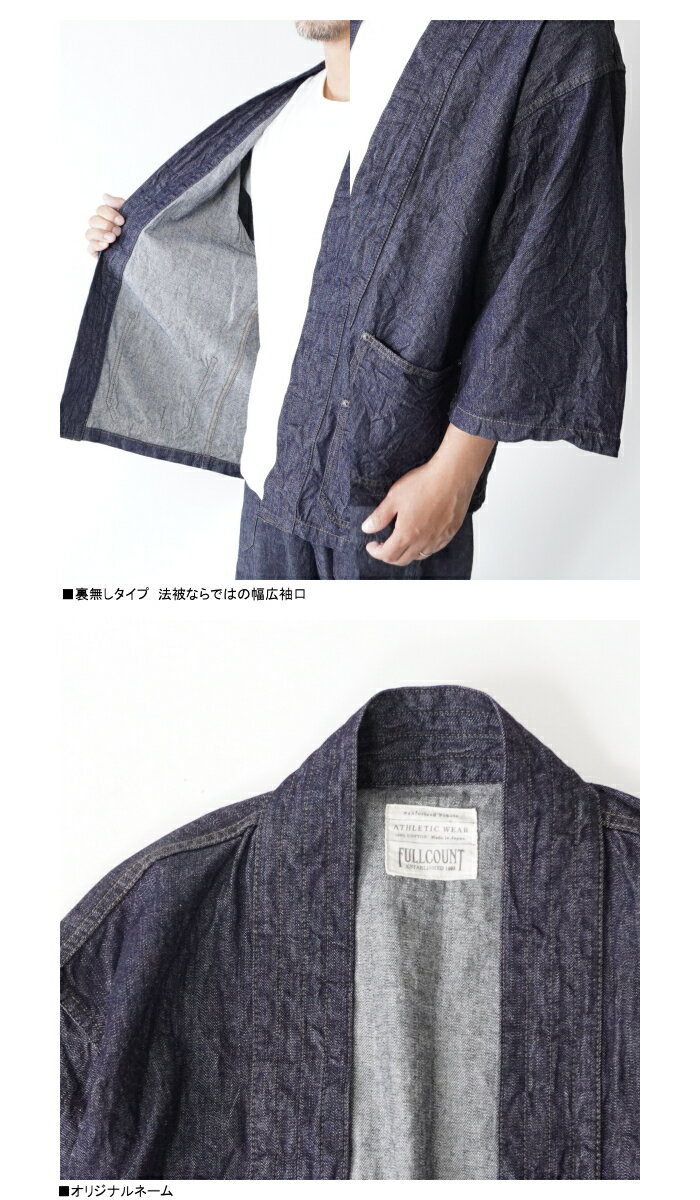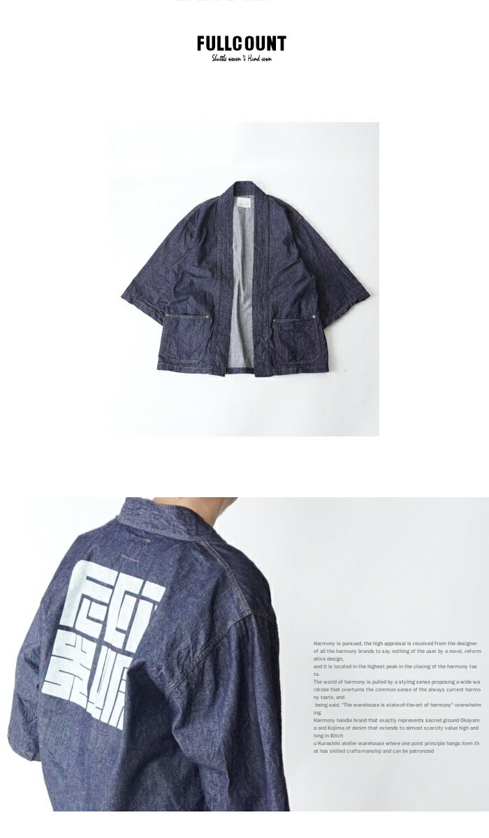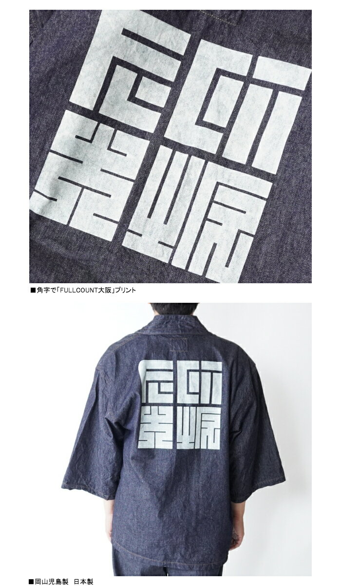 FULLCOUNTフルフルカウント 2021 Denim Happi Jacket 角字プリント デニムはっぴジャケット ワンウォッシュ 日本製 羽織りジャケ 半端袖 岡山児島デニム デニムコート
