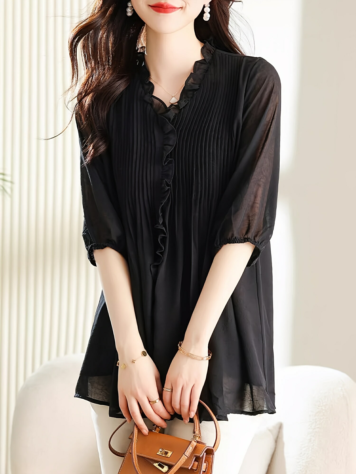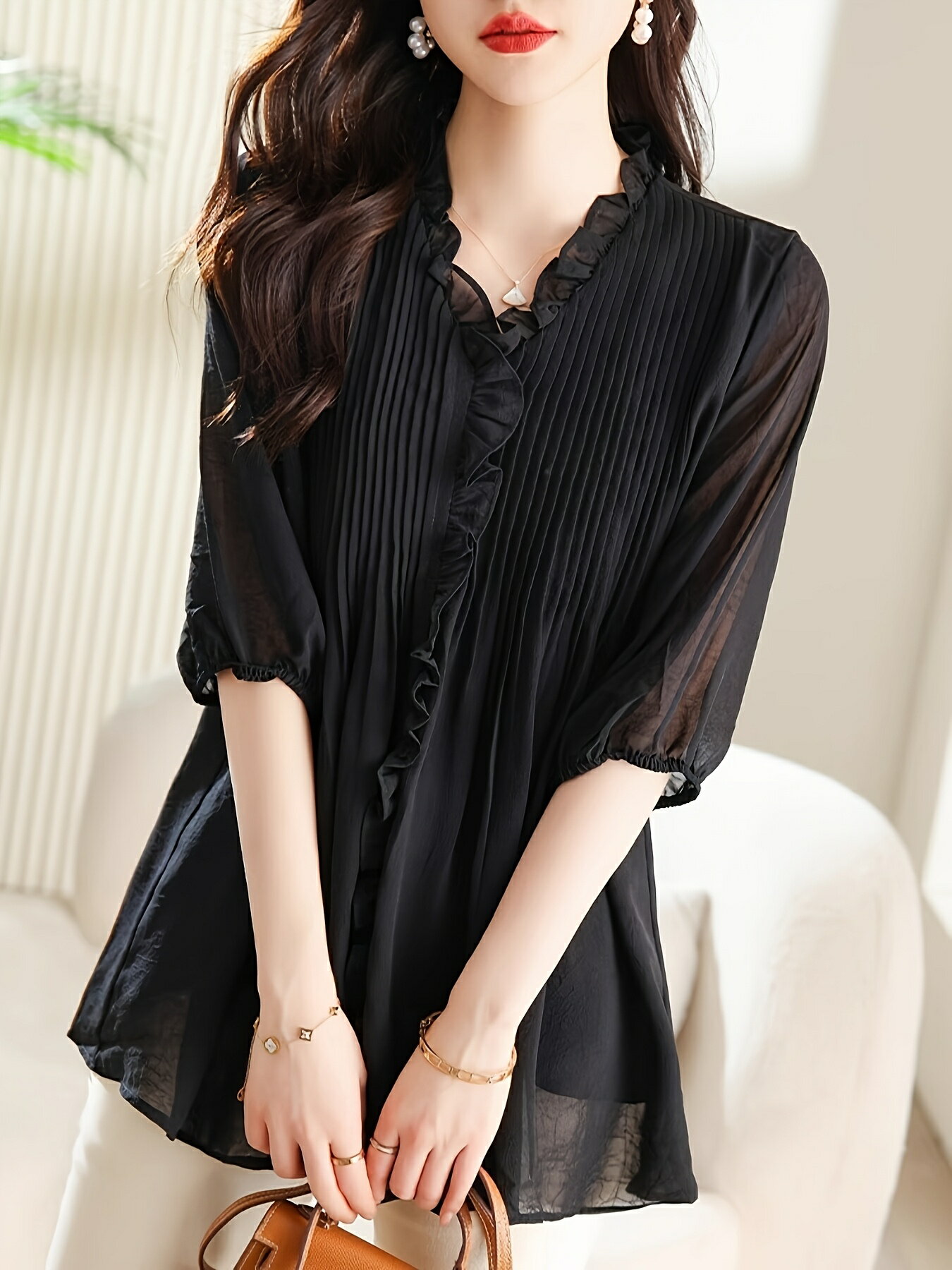 上品なVネックブラウス、半袖、ゆったりシルエット、春夏