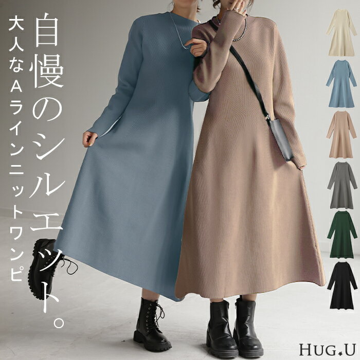 ワンピ 「 隠すよりメリハリ。」 ニット ワンピース ■一部8月上旬入荷 Aライン レディース ニットワンピ ニットワンピース ロング ロングワンピ リブ きれいめ 長袖 ボートネック シンプル タイト 軽量 体型カバー 無地 すっきり 伸縮性 グリーン 黒 春 夏 HUG.U