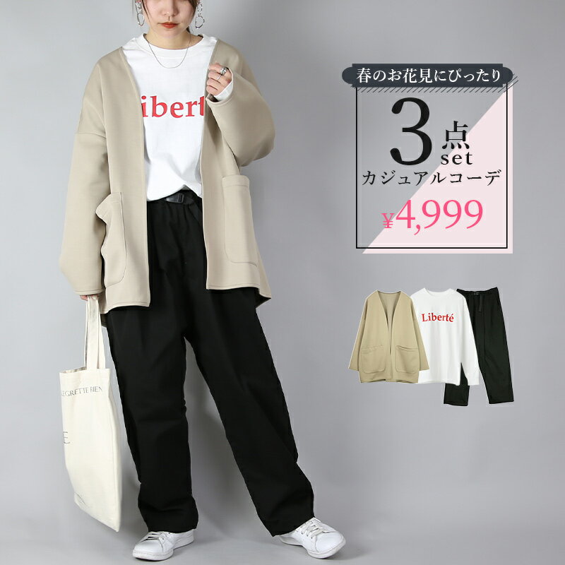 セット レディース 3点セット《春のお花見にぴったり!カジュアルコーデセット》 ジャケット 羽織り カットソー ロンティー ロゴT 長袖 長そで ボトムス パンツ 大人可愛い カジュアル 大人カジュアル ゆったり 楽ちん ラフ 体型カバー 花見 桜 ピクニック メール便不可