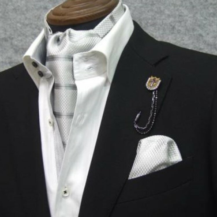 ◆礼装◆アスコットタイ チーフ付 ◇シルバー縞◇シルク100% 日本製 メンズ フォーマル 結婚式 新郎 acc-cf1