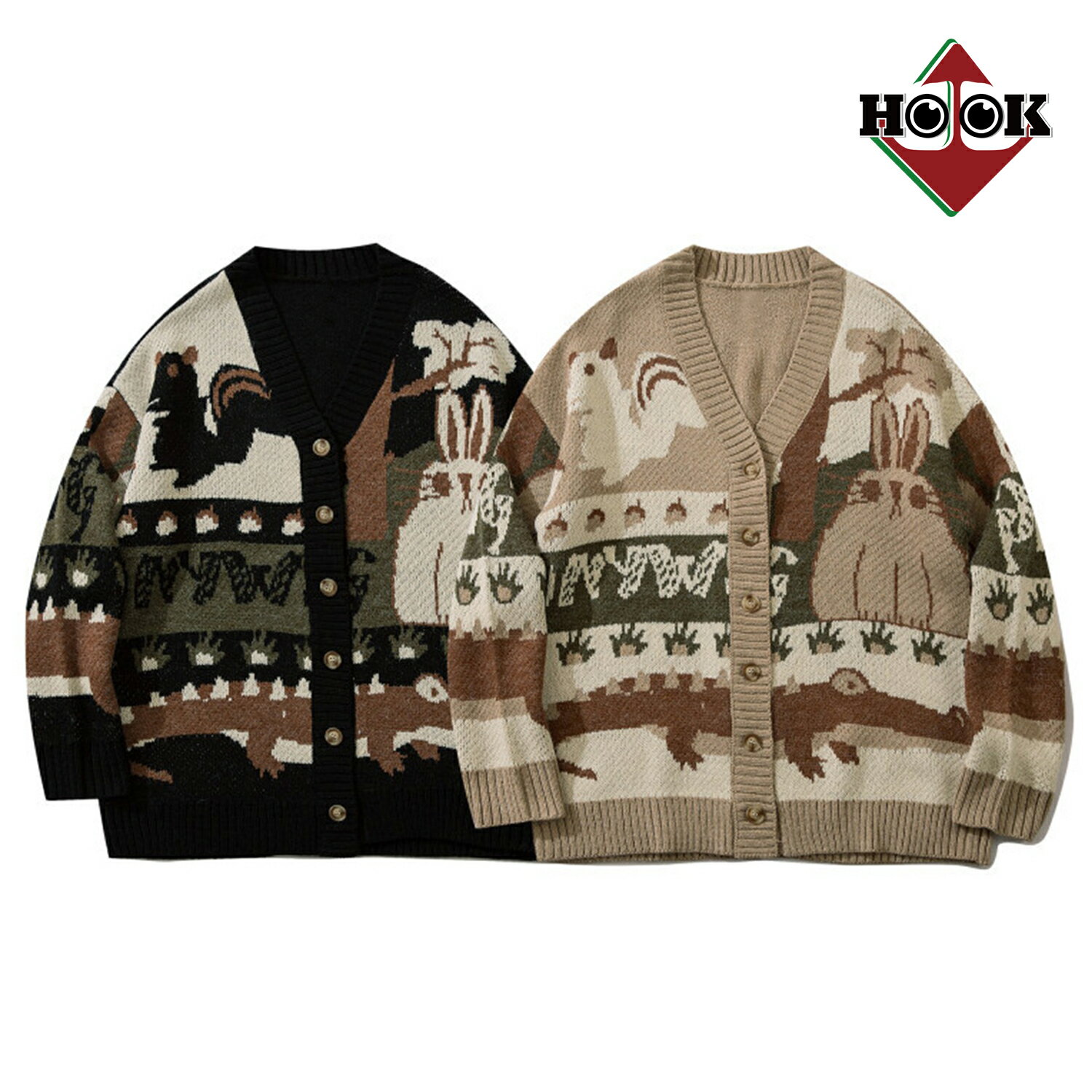 カーディガン メンズ レディース ニットカーディガン セーター カップル ペアルック お揃い 春 秋 ビッグシルエットオーバーサイズ ユニセックス 韓国ライク オルチャン うさぎ イラスト レトロ 古着風 ストリート【HOOK】
