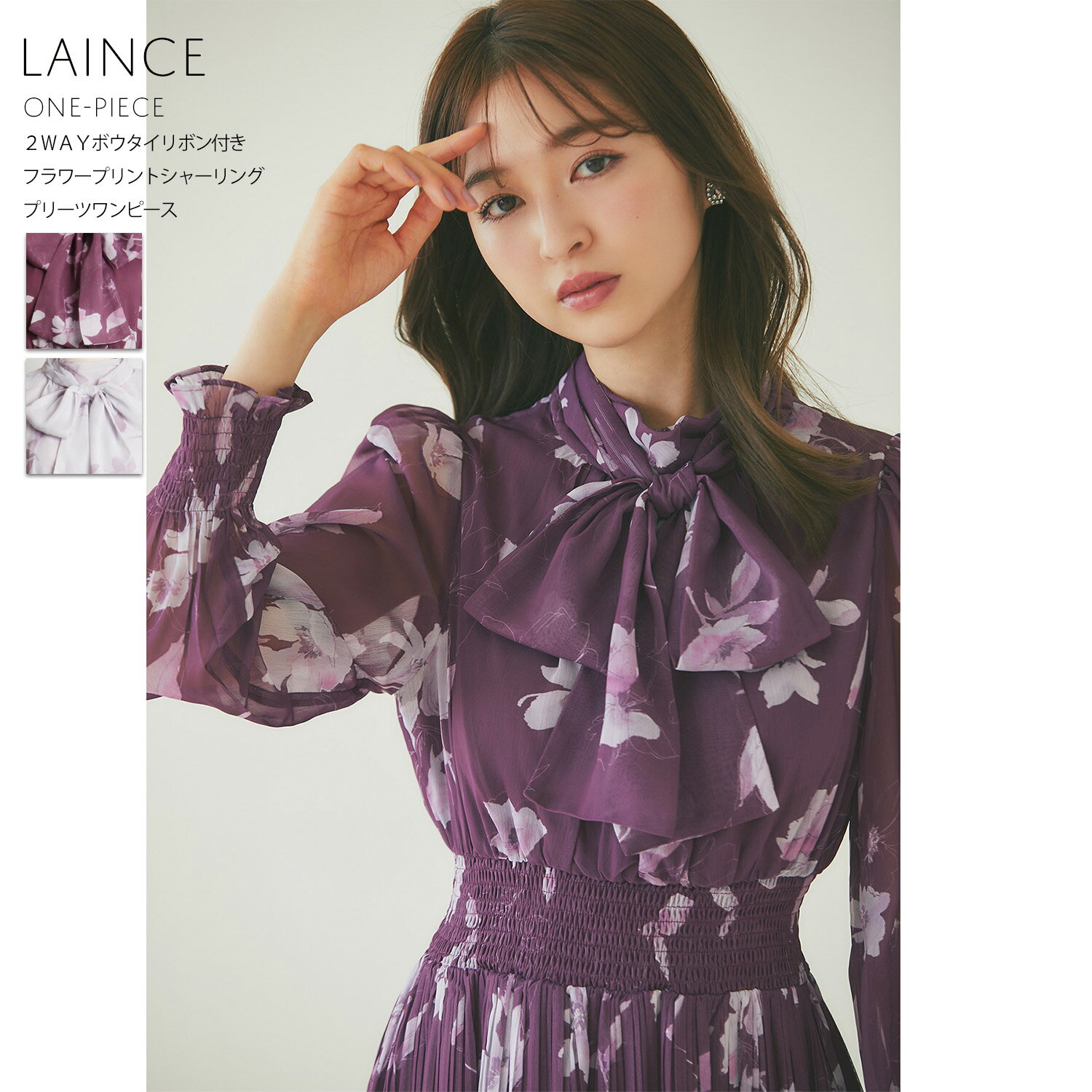 2WAYボウタイリボン付きフラワープリントシャーリングプリーツワンピース【laince レインス】tocco closet(トッコクローゼット) #58 ワイン #101 ピンクベージュ 186-189875