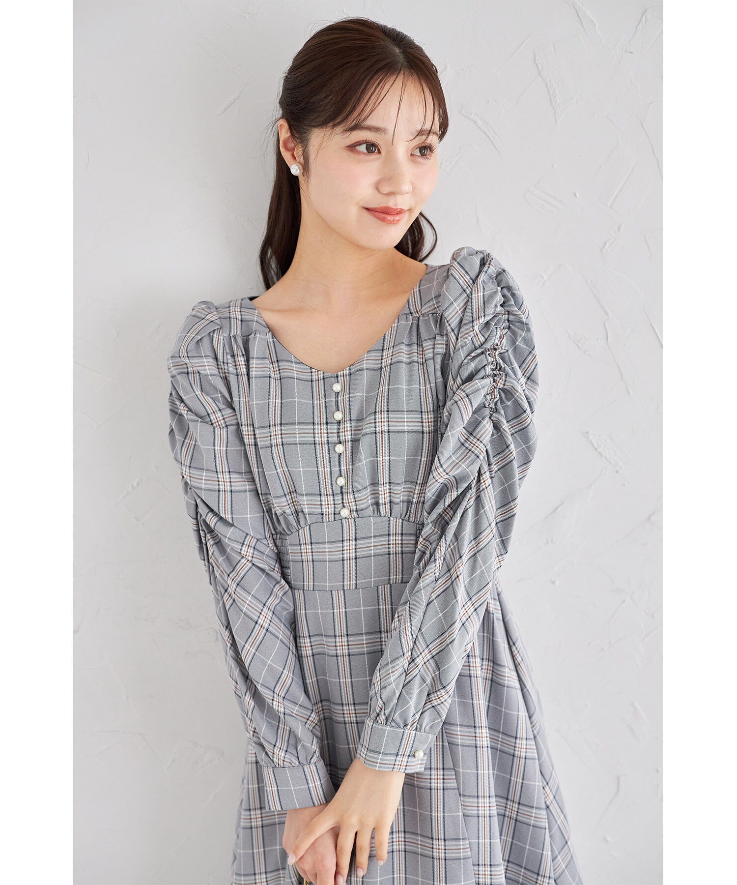 パール付きチェック柄パワーショルダーワンピース【rinter リンター】tocco closet(トッコクローゼット) ベージュ ネイビー 商品番号:186-190371
