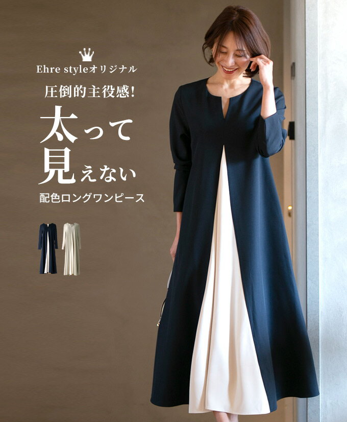 ワンピース ロングワンピース Aライン バイカラー 配色 スリット Vネック フレア レイヤード ジッパー ネイビー ベージュ Ehre style スタイル エーレスタイル【F240413】