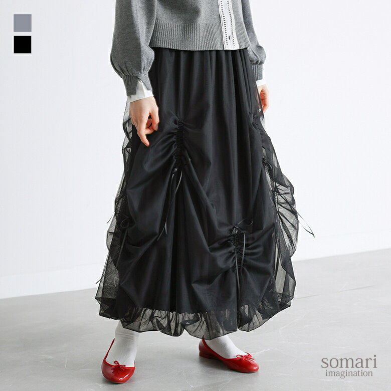 [1/31 23:59迄クーポンで15%OFF]スカート レディース ボトムス ロングスカート チュール バルーン リボン ドロスト 2枚重ね 体型カバー 大人カジュアル 大人可愛い オケージョン オシャレウォーカー【メール便不可】【30】