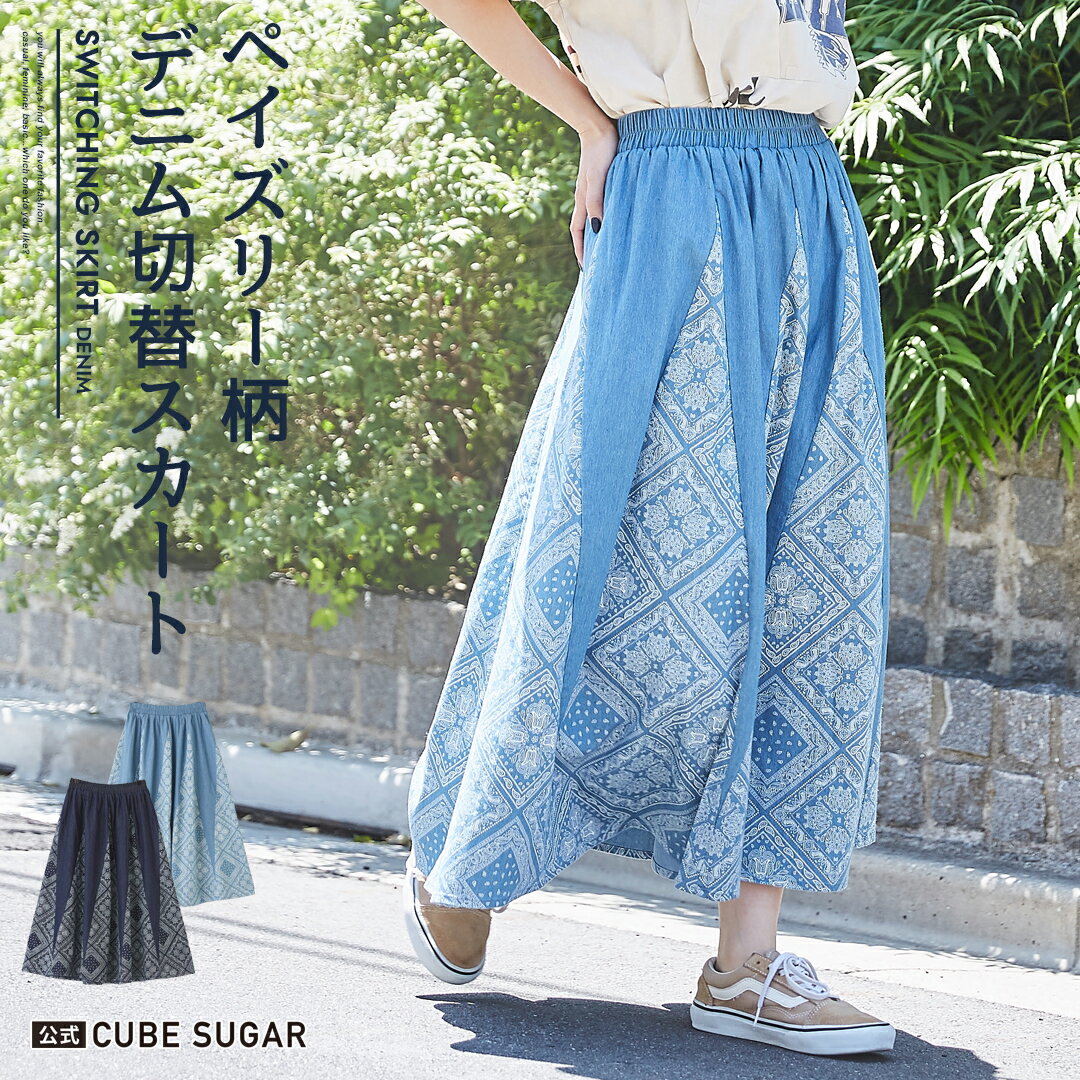 デニムスカート / 公式 CUBE SUGAR ペイズリー プリント デニム 切替 スカート(2色): アメカジ レディース ボトムス ロングスカート バンダナ柄 フレア ロング丈 ウエストゴム ジーンズ カジュアル キューブシュガー