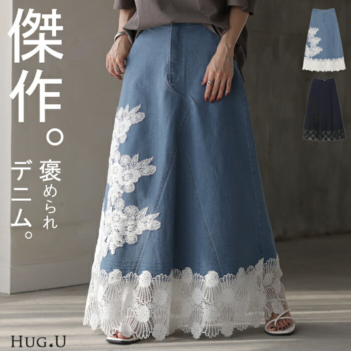 スカート デニム ロング レース ■8月上旬入荷 花柄 刺繍 レディース ボトムス デニムスカート ロングスカート Aライン フレア フレアスカート マキシ マキシスカート ハイウエスト ウエストゴム 体型カバー 大きいサイズ ネイビー ブルー 春 夏 HUG.U