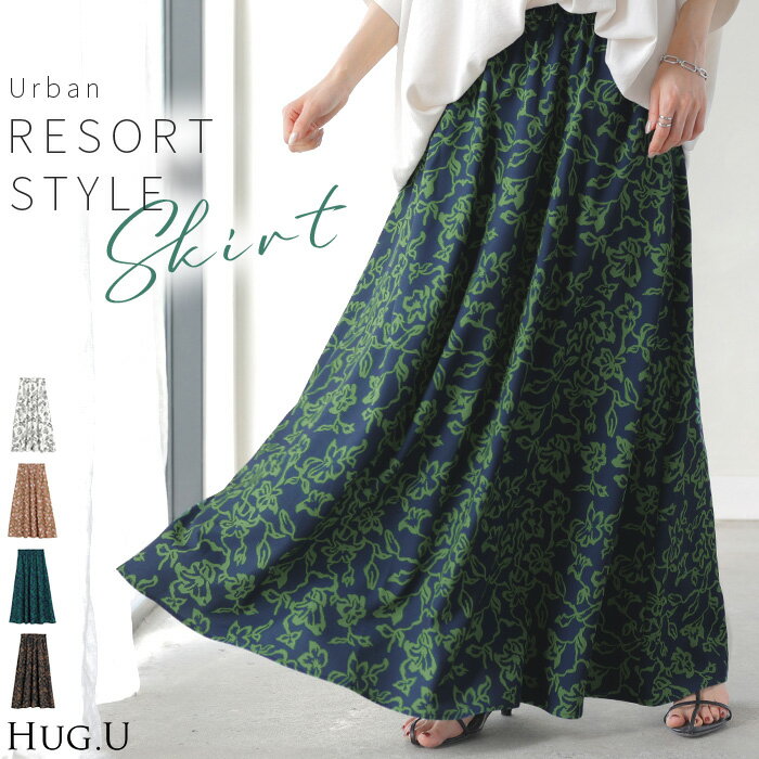 スカート 柄 ロング 【即納】 Aライン レディース ロングスカート 総柄 ボトムス ボトム フレア フレアスカート マキシ マキシスカート シワになりにくい ウエストゴム ポケット 無地 長い ゆったり きれいめ ハイウエスト おしゃれ 黒 白 春 夏 HUG.U