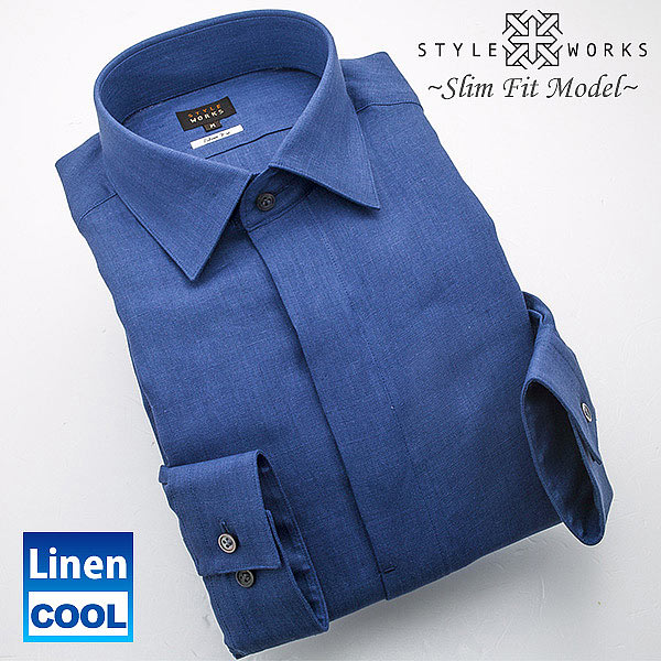 国産長袖ドレスシャツ リネン100% スリムフィット ショートレギュラー ネイビー フライフロント【OUTLETS】