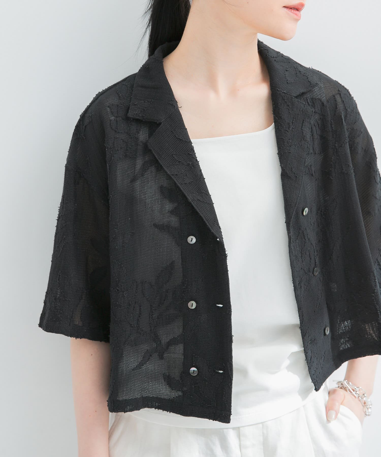 カットレースハーフスリーブカーディガン / レディース 春 夏 半袖カーディガン 襟付きカーディガン レースシャツ ハーフスリーブ レイヤード レギュラーカラー コットン混 select moca セレクトモカ