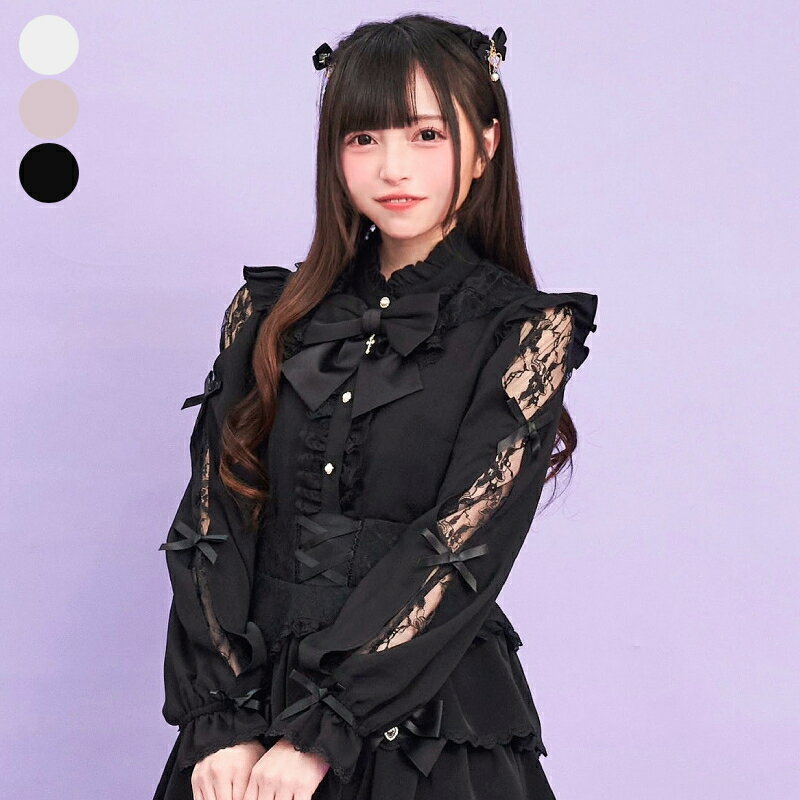 袖スリットレースラッフルブラウス4/2 12:00 販売スタートsecrethoney シークレットハニー シーハニ 量産型 レディース ガーリー 長袖 ホワイト 白 グレー ブラック 黒
