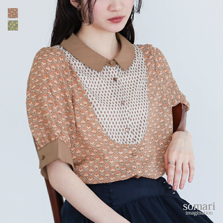 『レトロ柄ボザム切替ブラウス』[somari imagination ブラウス レディース 春夏 半袖 五分袖 ぽわん袖 総柄 無地 襟付き ボタンシャツ ボザム 配色 ギャザー マルチカラー]※メール便可※【5】