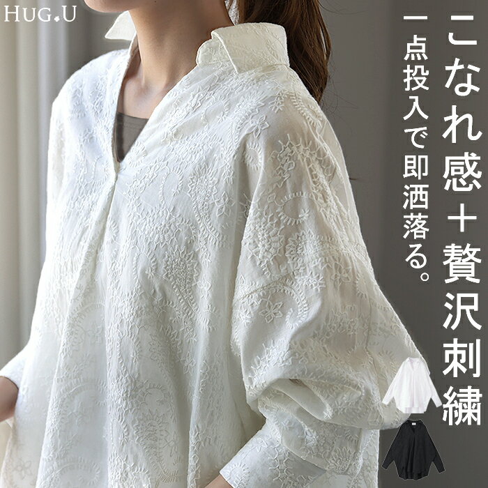 贅 沢 刺 繍 シアー 』 ドルマン シャツ レディース ■一部10月上旬入荷 チュニック トップス 刺繍 オーバーサイズ ロングシャツ 長袖 薄手 スキッパー 花柄 ロング レース シースルー 体型カバー きれいめ シアー 大きいサイズ ブラック 黒 白 秋 冬 HUG.U