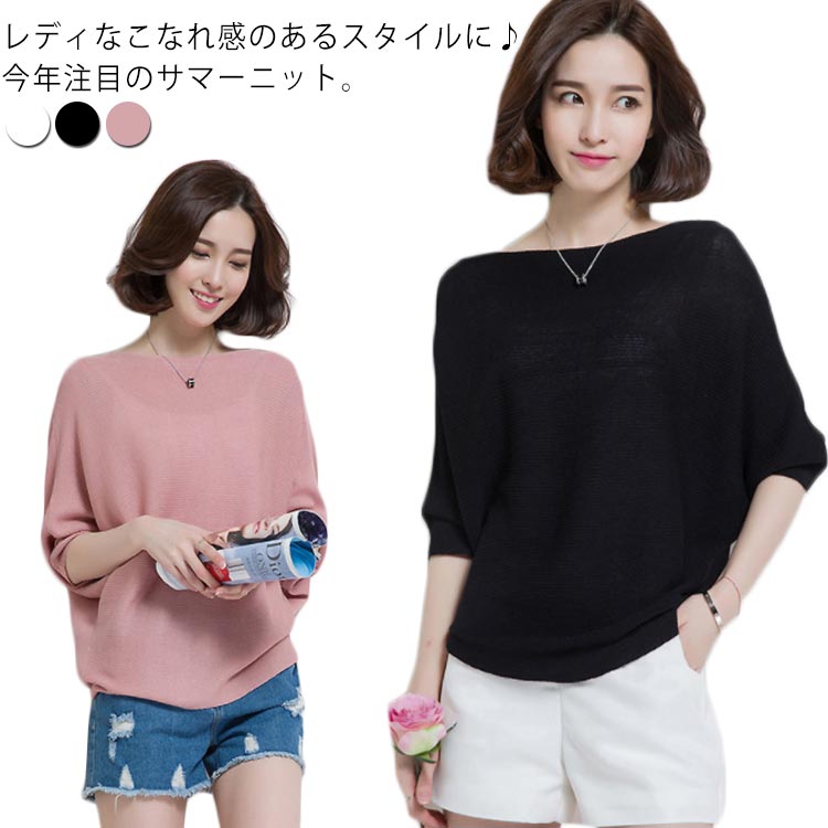 サマーニット ドルマンスリーブ トップス レディース ニットソー 半袖 シンプル ボートネック プルオーバー ゆったり 大きいサイズ 夏物 薄手