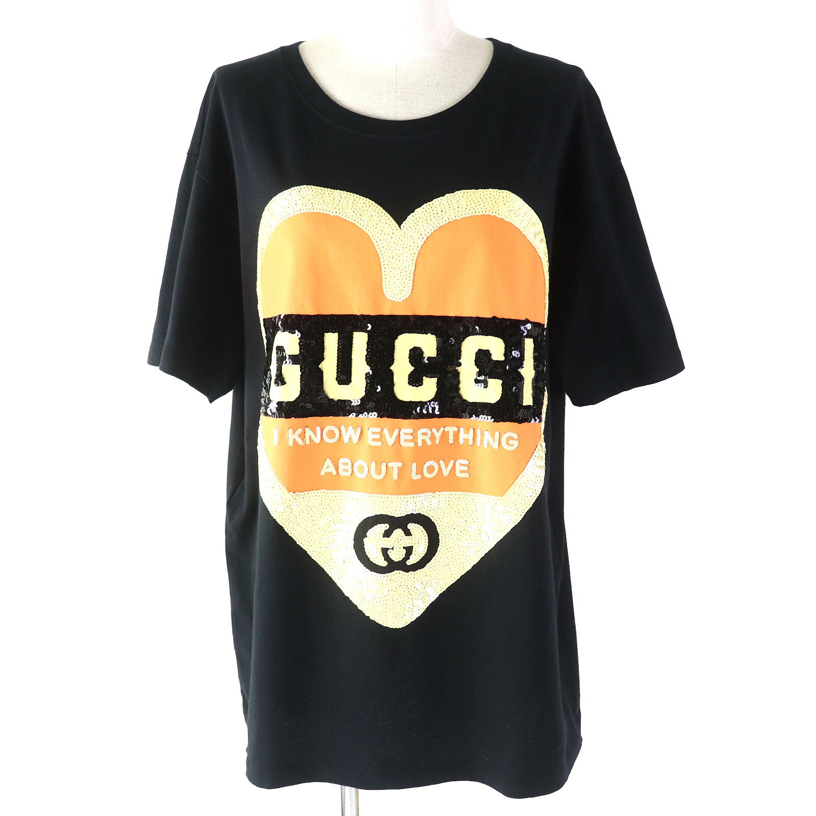 美品△GUCCI グッチ 492347 コットン100% ロゴ ハート スパンコール 半袖Tシャツ ブラック イエロー オレンジ系 L イタリア製 正規品 レディース【中古】