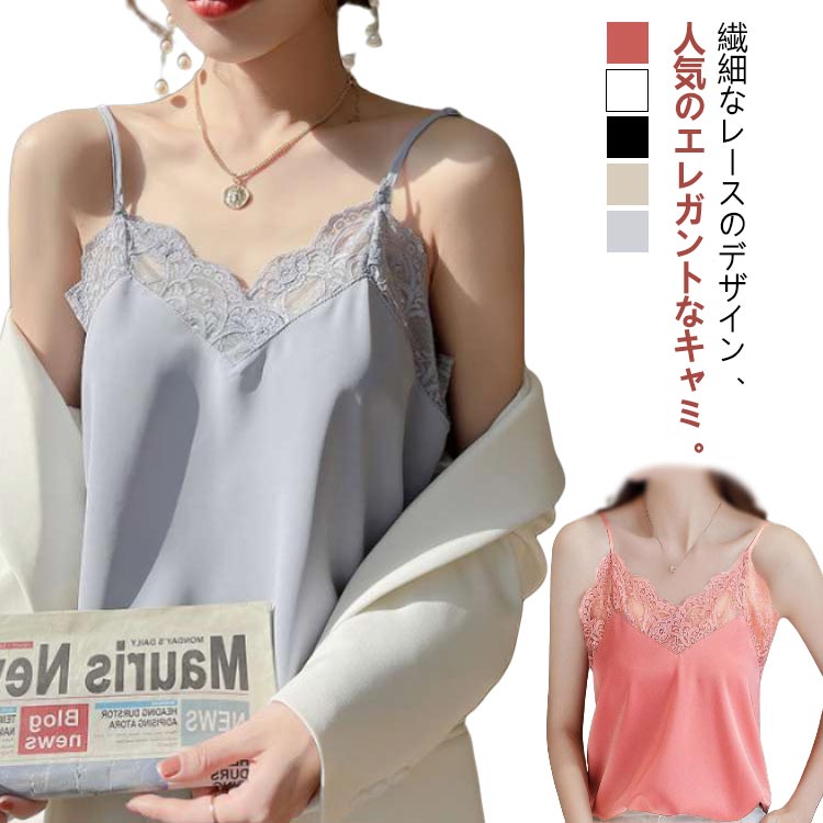 【送料無料】キャミソール レディース インナー 無地 Vネック ノースリーブ レース付き 光沢感 トップス カジュアル 着回し 肌触り良い 着心地いい 女性らしい セクシー お出掛け 快適 春夏 サテン 女性用 重ね着 肌着 下着 アンダーウェア