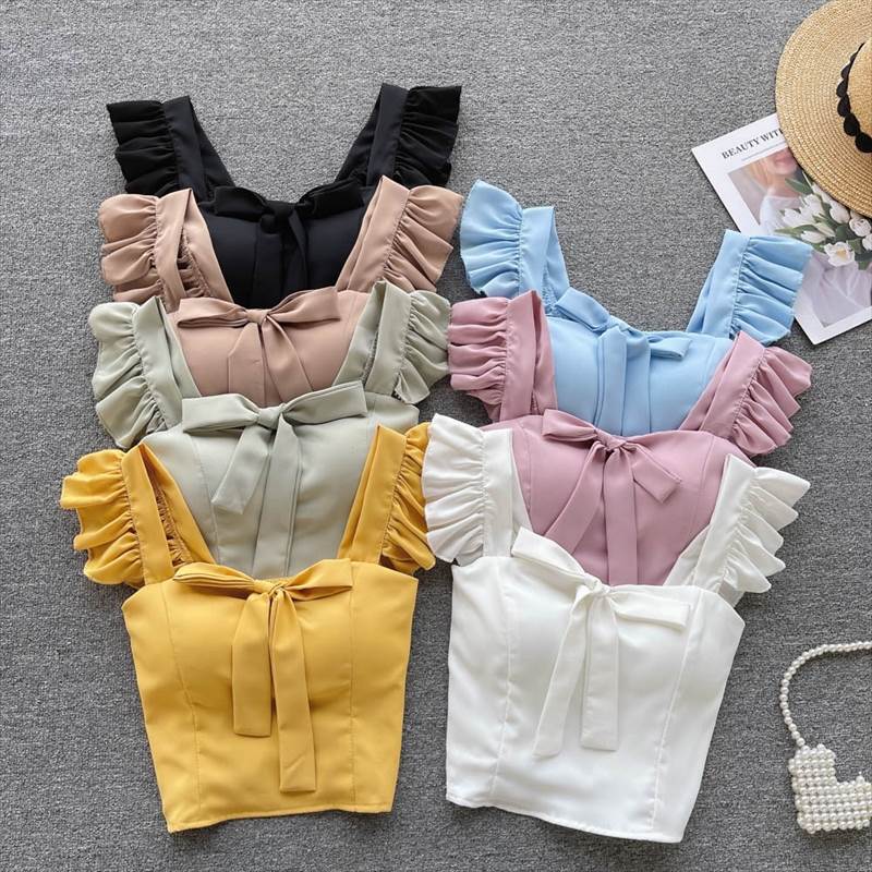 【本日20%クーポン有】ビスチェ ショート丈 フリル トップス レディース ノースリーブ 個性的 春 夏 スクエアネック デコルテきれい 背中空き 肌みせ リボン バック 後ろ シャーリング ブラック 黒 ホワイト 白 ベージュ 緑 グリーン ピンク ブルー 青 イエロー 黄色 無地