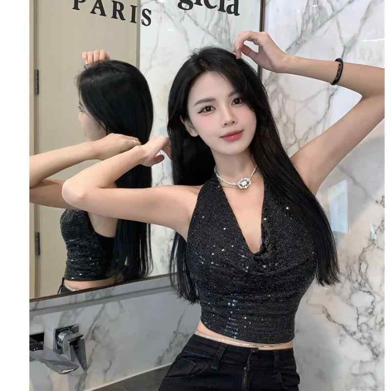 スパンコール トップス ホット ガール レディース ホルター キャミソール 夏 ショート タイト スリム フィット 痩身 細身 黒 シルバー
