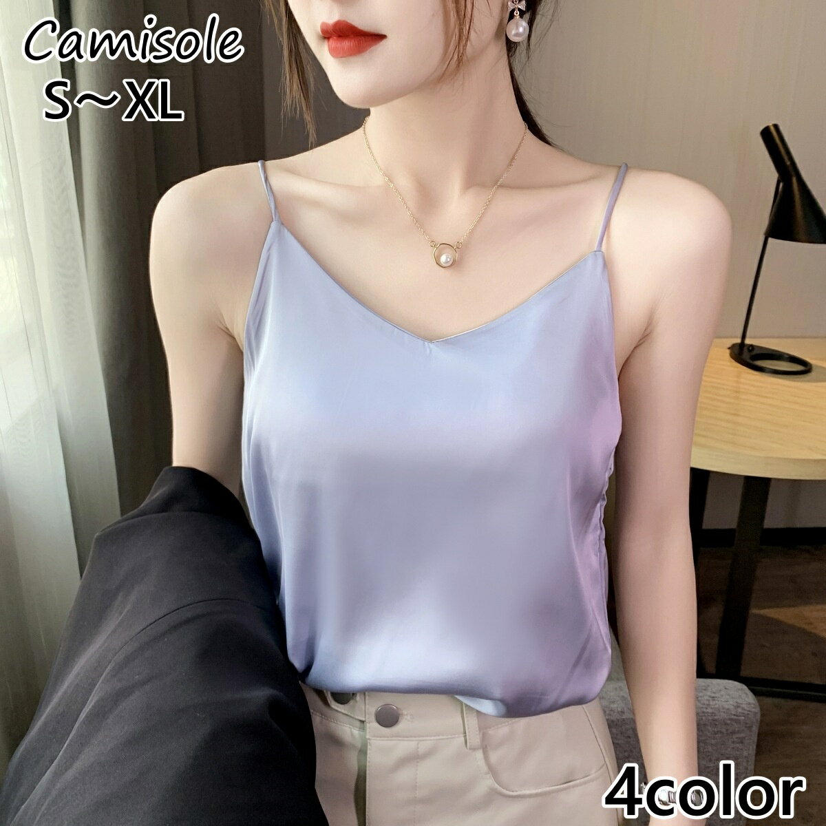 送料無料 キャミソール レディース トップス Vネック サテン調 細紐 着回し シンプル 無地 カジュアル おしゃれ 薄手 普段使い 肌見せ 光沢感
