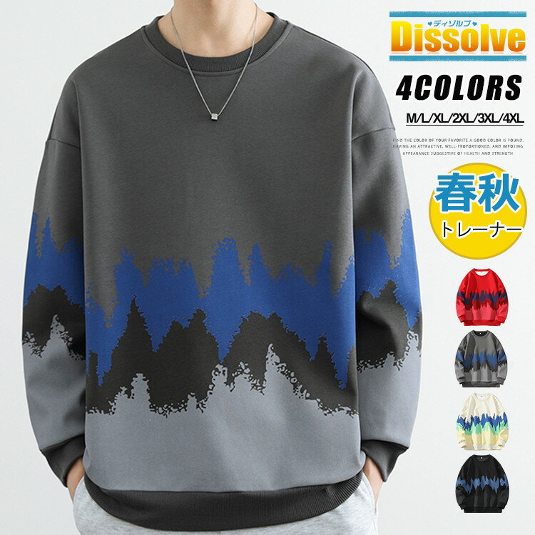 メンズトレーナー 長袖 メンズ クルーネック スウェットシャツ グラデーション トレーナー トップス ロンティー カラー切替 プルオーバー 春服 秋服 スウェット スポーツ かっこいい
