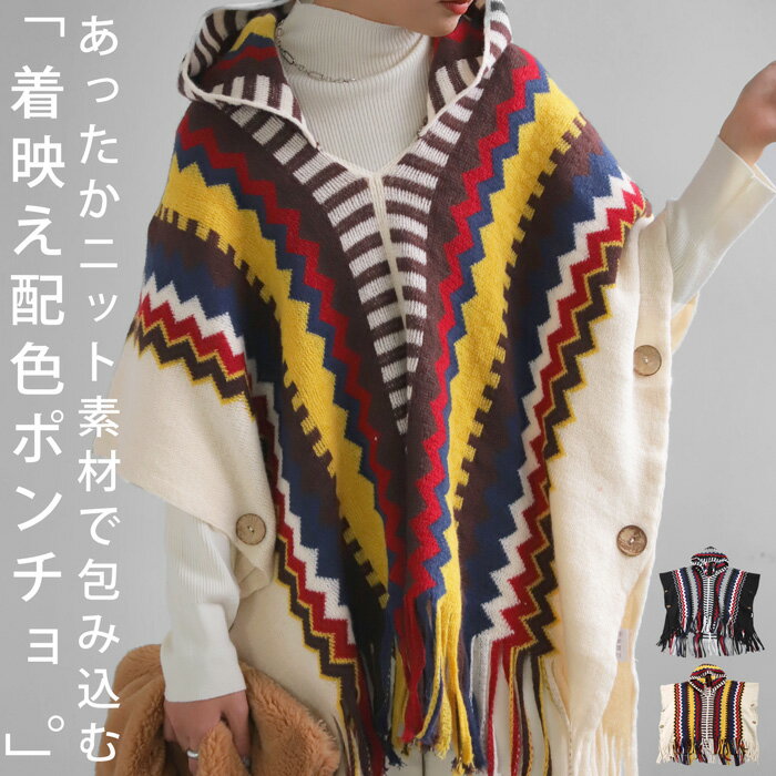 ポンチョ ニットポンチョ 羽織り レイヤード フリンジ ケープ パーカー 大判 大きめ 総柄 柄 フリンジポンチョ 実用的 お出かけ 防寒対策 秋冬 カジュアル レトロ 大人 レディース おしゃれ 誕生日 プレゼント AminaCollection