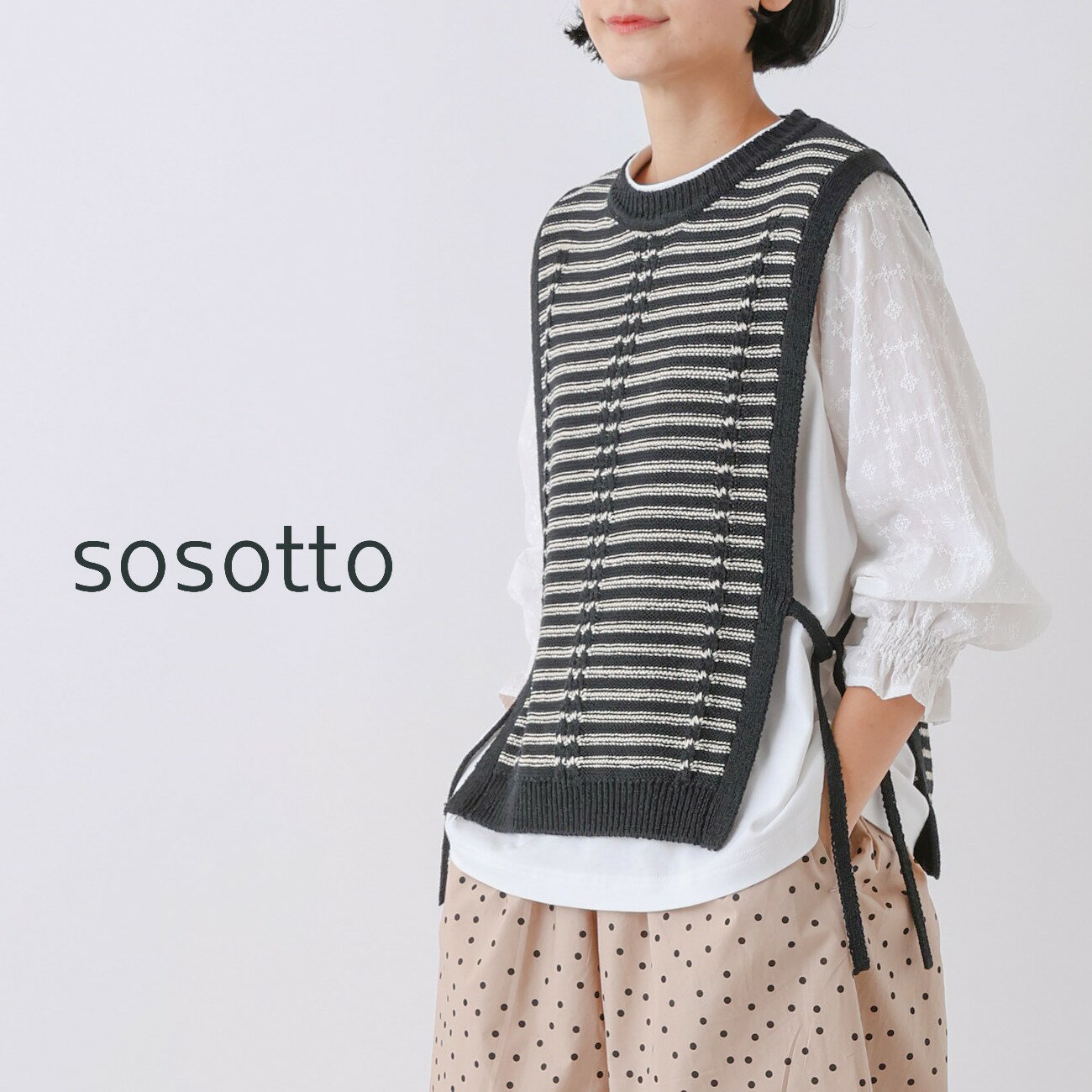 【14%オフ・クーポン対象】sosotto ソソット ベスト ニット サイド リボン ケーブル 編み クルーネック テープ ヤーン 2025年春夏物