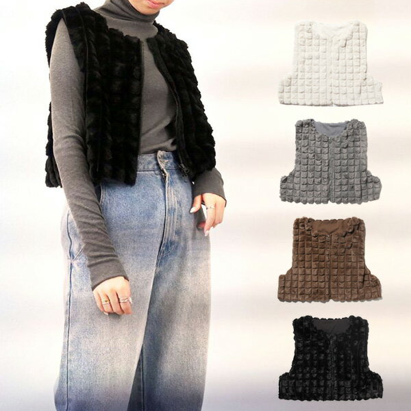 ジレ ベスト ショート丈 クロップド丈 ファー ジップアップ 無地 前開き アウター レディース エクリュ グレー モカ ブラック