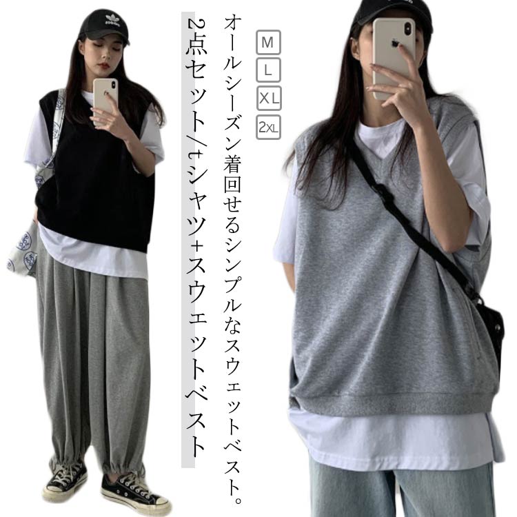 チョッキ トレーナー スウェット ノースリーブパーカー ジレ Vネック レディース ベスト 韓国 春 おしゃれ トップス プルオーバー 2点セット/tシャツ+スウェットベスト ベスト レイヤード 重ね着 大人可愛い ベスト 夏 無地 大きいサイズ 秋 カジュアル