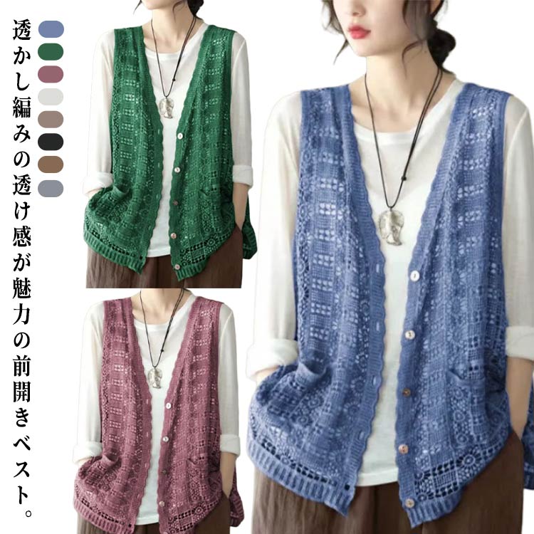 ベスト レディース 夏 ジレ ショート丈 透かし彫り 透け感 透かし編み 透け感 サマー カーディガン 薄手 重ね着 ノースリーブ お洒落 体型カバー ゆったり きれいめ カジュアルエレガント 通勤 20代 30代 40代 50代 60代 F