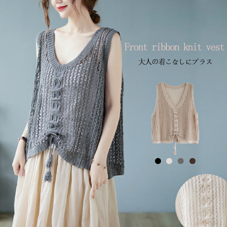 透かし編み ニット ベスト レディース 綿 大きめ 透ける ニットベスト 夏 リボン 重ね着 サマーニット ノースリーブ vネック ゆったり 夏ベスト 薄手 vネックベスト お洒落 きれいめ ストレッチ コットン 綿ベスト 通気性 編地 切り替え