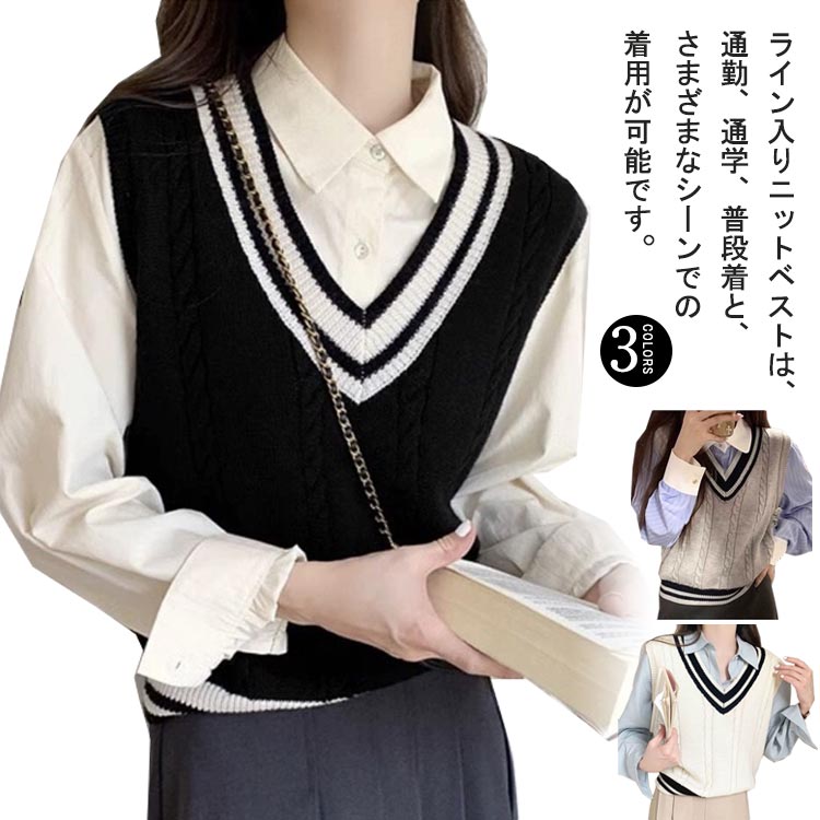 ライン入りニットベスト スクールベスト 制服 ベスト Vネック ノースリーブセーター ニット 学生服 秋冬 中学 ホワイト 高校 通学 スクール 制服 JK ニットベスト 女子高生 ケーブル編み ライン入りニットベスト 定番 配色
