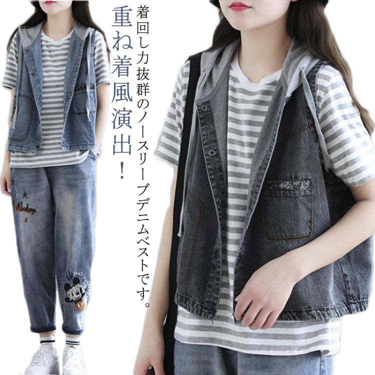 フード付き 春夏 ベスト おしゃれ デニム ベスト レディース 春 ジレ ベスト ベスト 春 デニム 前開き トップス ノースリーブ 羽織り 切り替え ベスト ジージャン 大きいサイズ カジュアル 重ね着 通勤 OL 送料無料