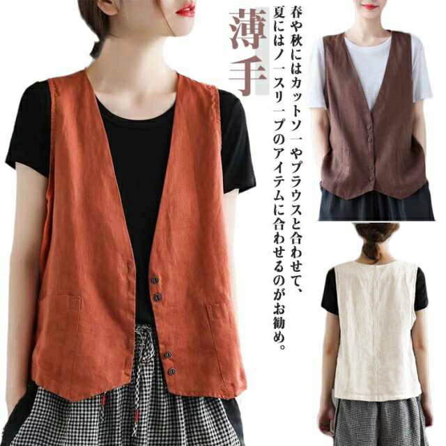 ベスト レディース 綿麻風 ベスト 前開き 薄手 夏服 ノースリーブ ジレ 無地 カジュアルベスト vネック トップス 羽織り 袖なし 大きいサイズ ゆったり シンプル ナチュラル 大人 レイヤード 重ね着 大きいサイズ ブラック 送料無料