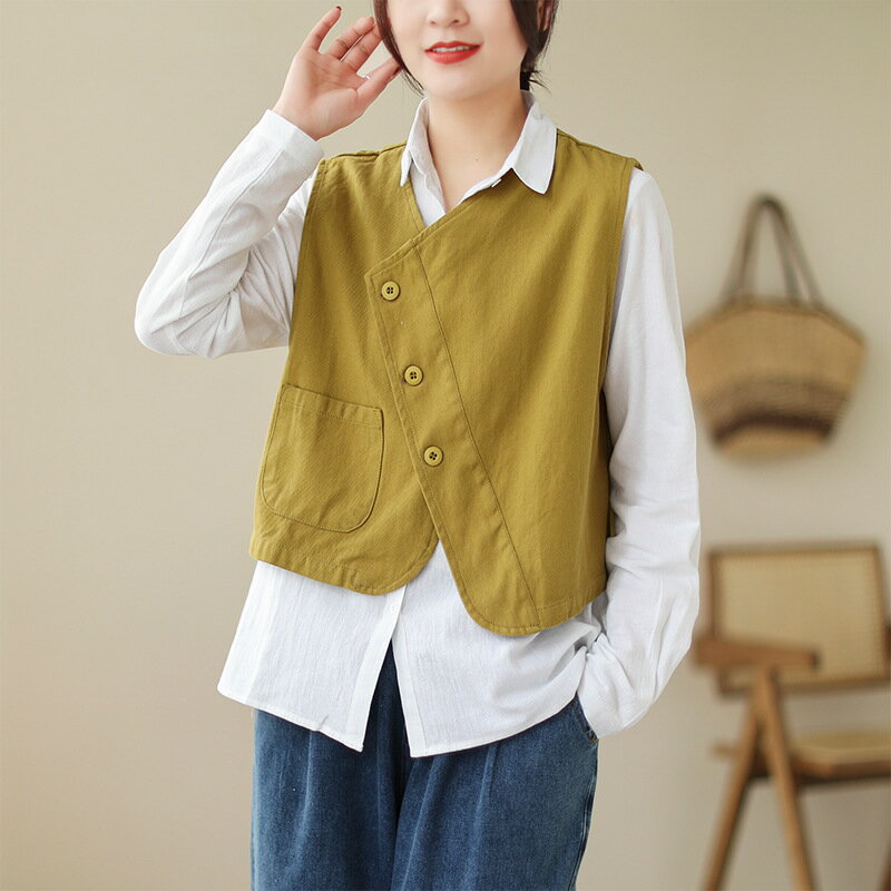 ベスト レディース 綿 チョッキベスト 春 夏 秋 前開き 無地 重ね着風 ポケット付き ショート丈 普段着 可愛い