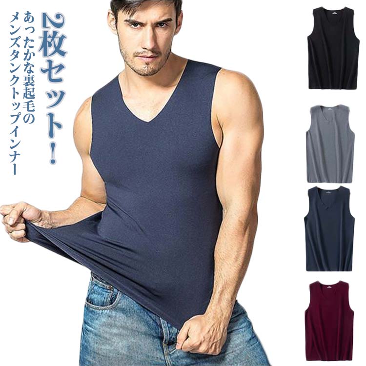 2枚セット 発熱インナー メンズ タンクトップ 裏起毛 インナートップス 肌着 ノースリーブ 下着 裏起毛タンクトップ シームレス フィット Vネック 保温 暖かい 防寒 あったか 冬対策 秋冬 男性用 アンダーウェア インナーウェア 無地 大きいサイズ